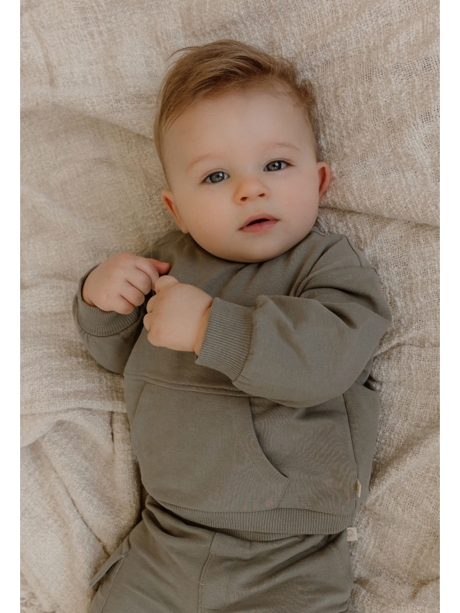 Deze zachte sweater voor newborn baby jongens is ideaal voor een comfortabele en stoere look. De kangoeroezak op de voorkant geeft de sweater een casual uitstraling én een speels detail. Gemaakt van een comfortabele sweatstof die zacht is voor de gevoelige babyhuid. Combineer hem met de bijpassende broek (W10327) voor een complete, gecoördineerde outfit.
