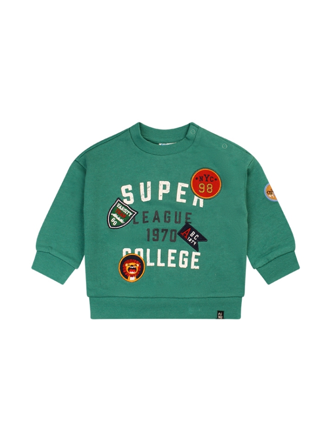 Deze baby jongens sweater is een echte stoere must-have! De trui heeft een coole tekstprint en stoere patches op de voorkant, wat zorgt voor een speels en trendy effect. Dankzij de zachte binnenkant draagt hij extra comfortabel. Combineer de sweater met een stoere jeans en een bodywarmer voor een complete, fashionable outfit.