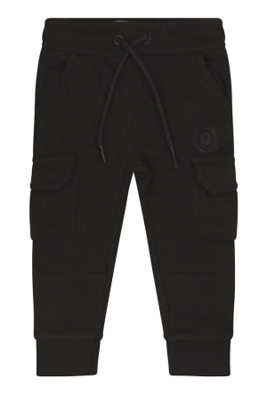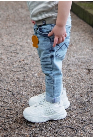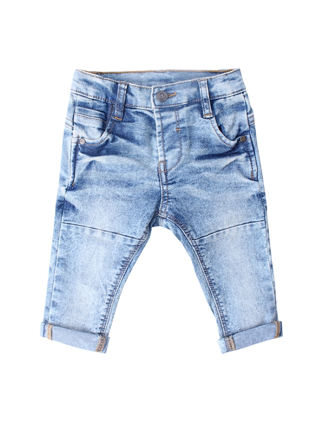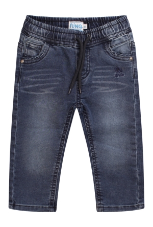Denim jeans van Flinq. De jeans hebben omslag pijpen en 5 zakken. De knoop is een schuifknoop en er zit elastiek aan de binnenkant om de broek strakker of losser te maken. Materiaal: 70% katoen, 29% polyester, 1% elasthan.