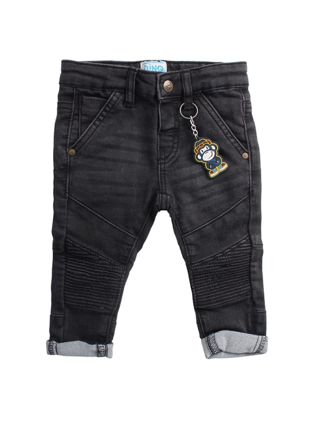 Jeans met sleutelhanger van Flinq. De jeans heeft kniestukken en een sleutelhanger van een aapje. Materiaal: 91% katoen, 8% polyester, 1% elasthan. 30 graden wassen, niet bleken, niet in de droger, niet chemisch reinigen, koud strijken.