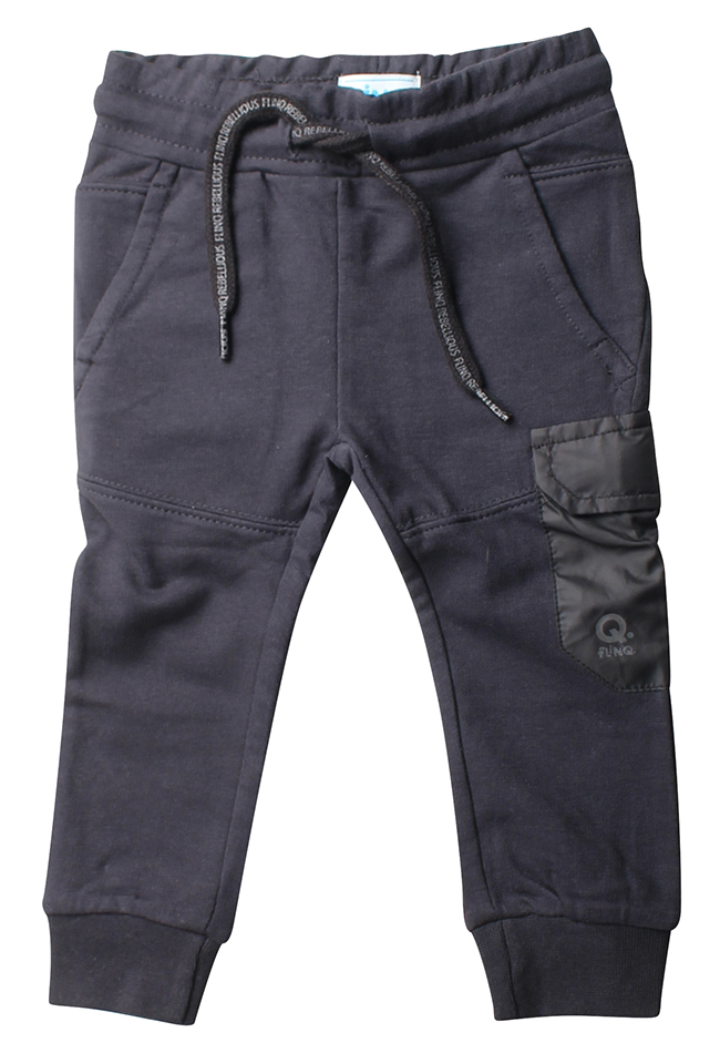Jogging broek van FlinQ. De broek heeft een nylon zijzakje. Materiaal: 95% katoen, 5% elashtan. Wassen op 30 graden, niet bleken, niet in de droger, kan gestreken worden.