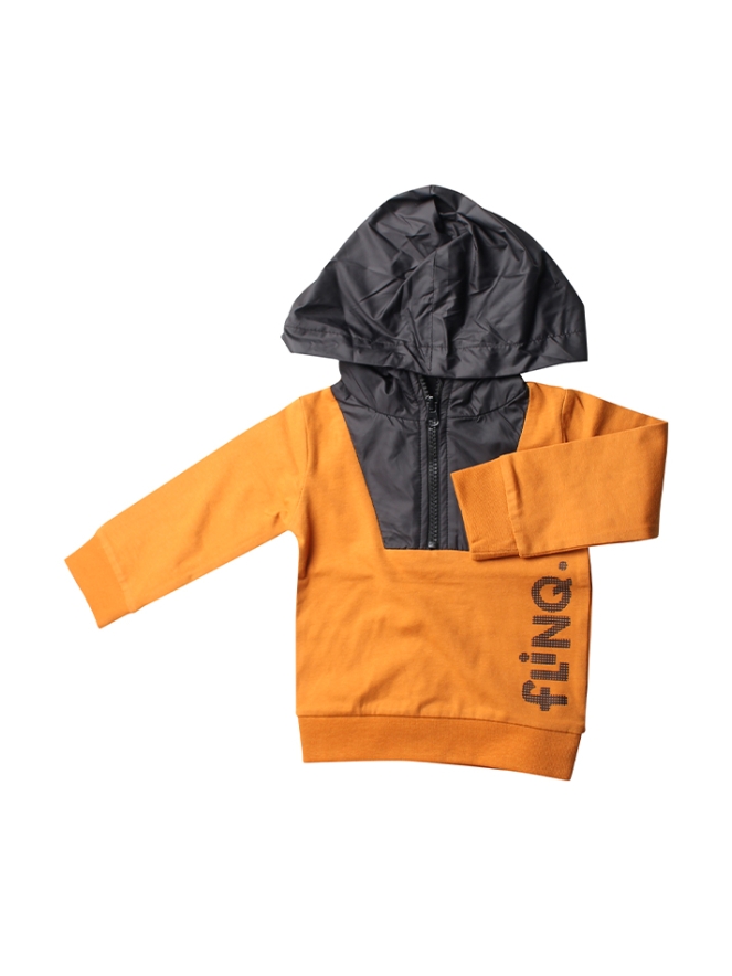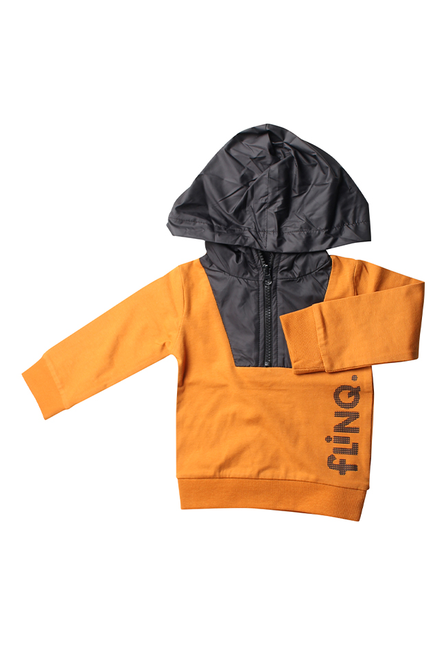 Trui van FlinQ. De trui heeft een capuchon van nylon materiaal en een rits. De rest van de trui is van sweat stof en heeft een logo op de voorkant. Materiaal: 95% katoen, 5% elastane. Wassen op 30 graden, niet bleken, niet in de droger, kan gestreken worden.