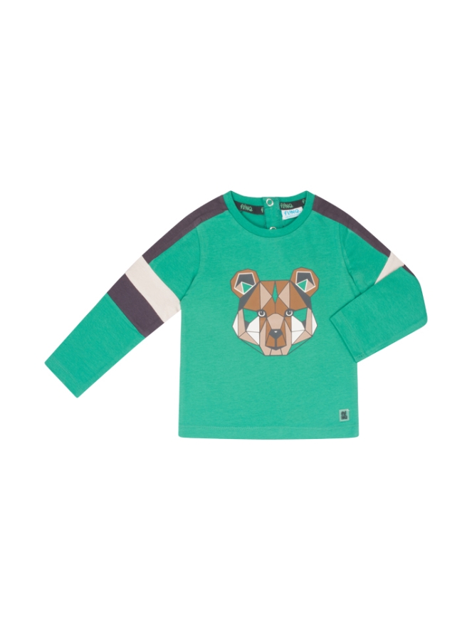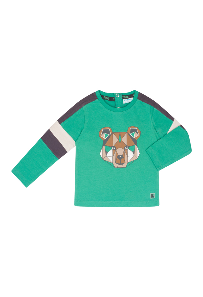T-shirt met lange mouw van FlinQ. Het t-shirt heeft een beren print op de voorkant en een color block op de mouwen. Materiaal: 95% katoen, 5% elasthan. Wassen op 30 graden, niet bleken, niet in de droger, kan gestreken worden.
