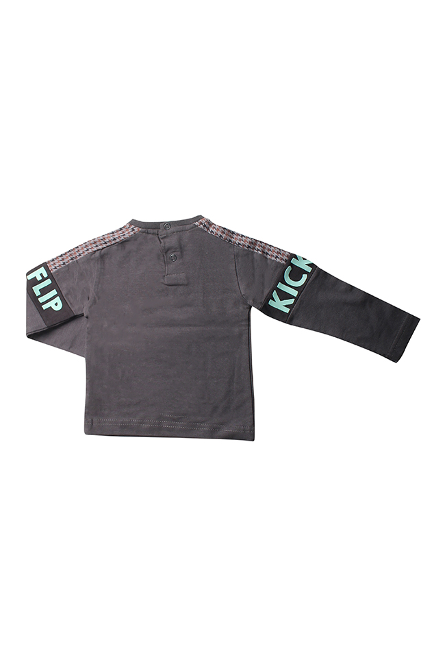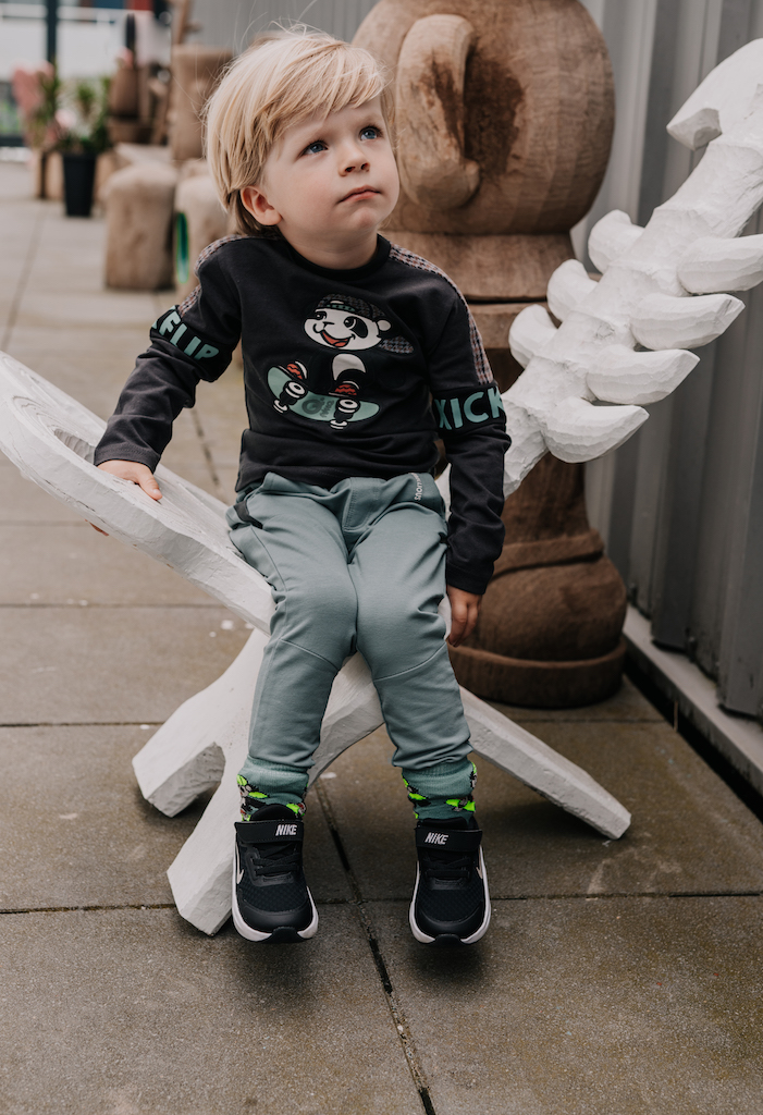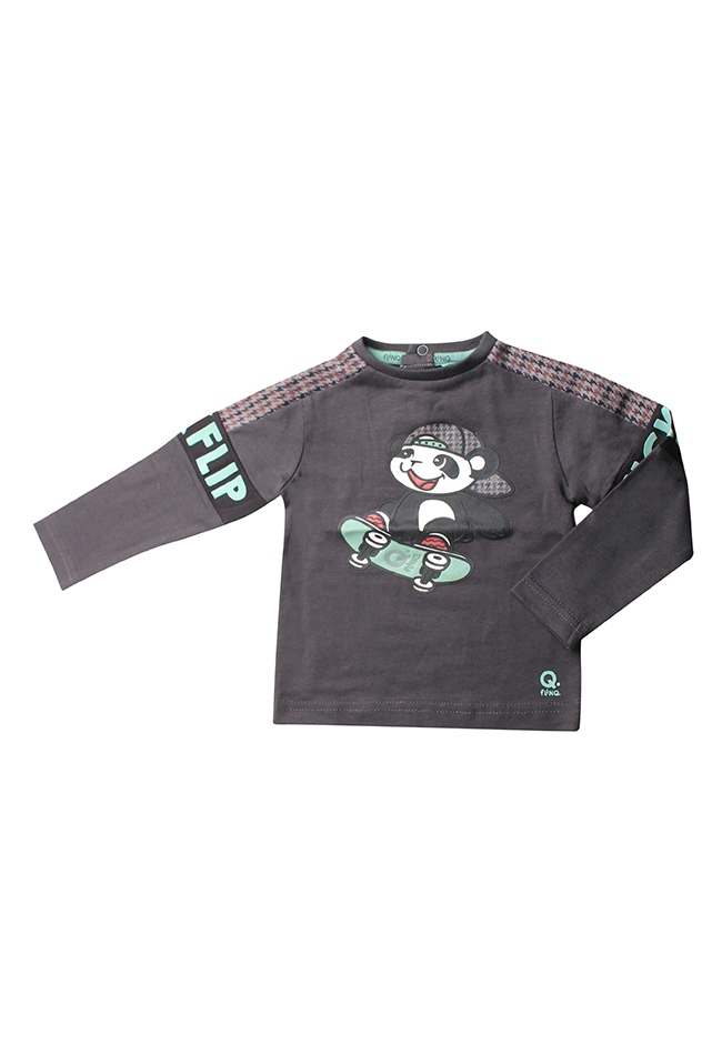 T-shirt van FlinQ. Het t-shirt heeft een panda met een skateboard op de voorkant. Op de mouwen zit een tekst band waar Kick flip op staat en op de schouders zit een pied de poule baan. Materiaal: 95% katoen, 5% elasthan. Wassen op 30 graden, niet bleken, niet in de droger, kan gestreken worden.