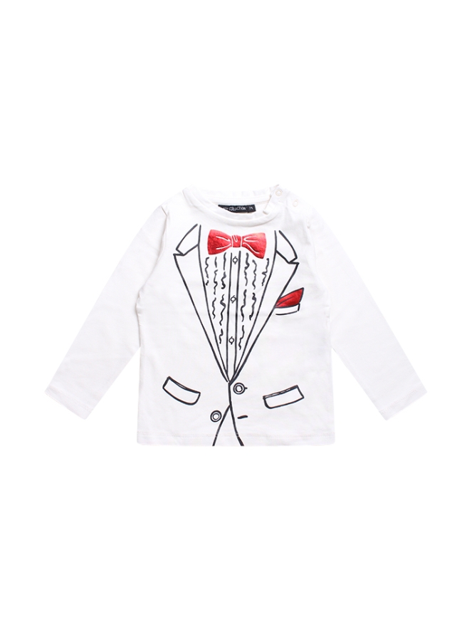 T-shirt met lange mouw van FlinQ. Het t-shirt heeft een jasjes print op de voorkant. Het lijkt hierdoor net een jasje met een strik. Materiaal: 95% katoen, 5% elasthan. Wassen op 30 graden, niet bleken, niet in de droger, kan gestreken worden.