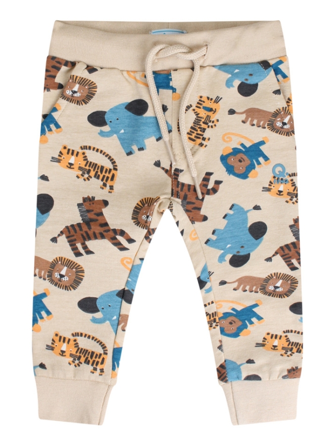 Baby jongens broek met elastische tailleband en twee steekzakken met en dierenprint.