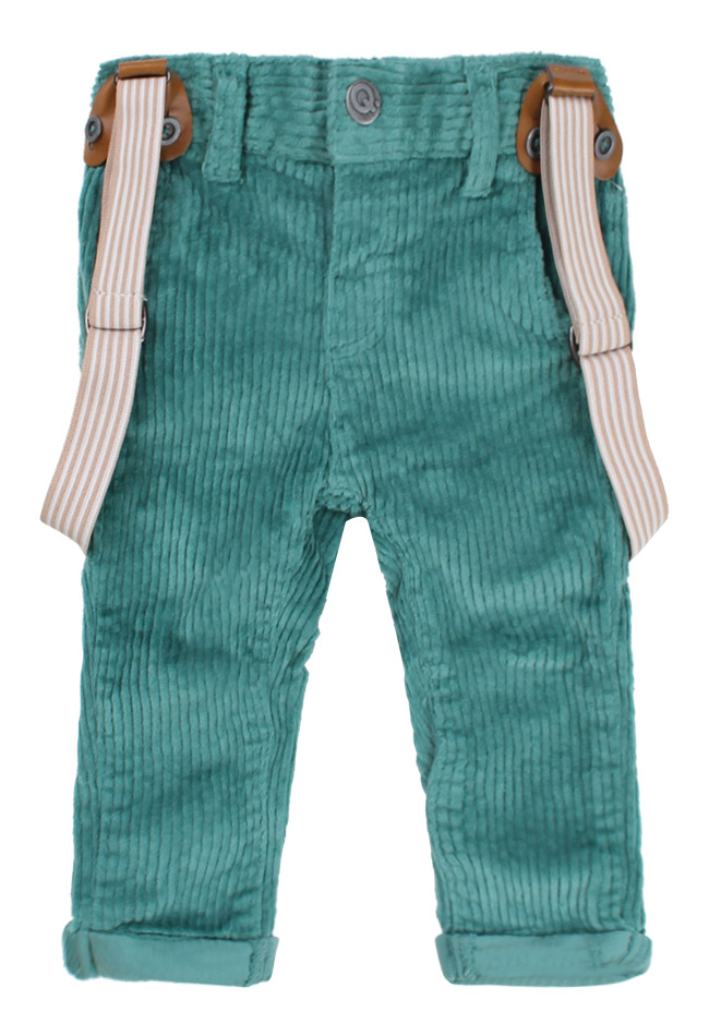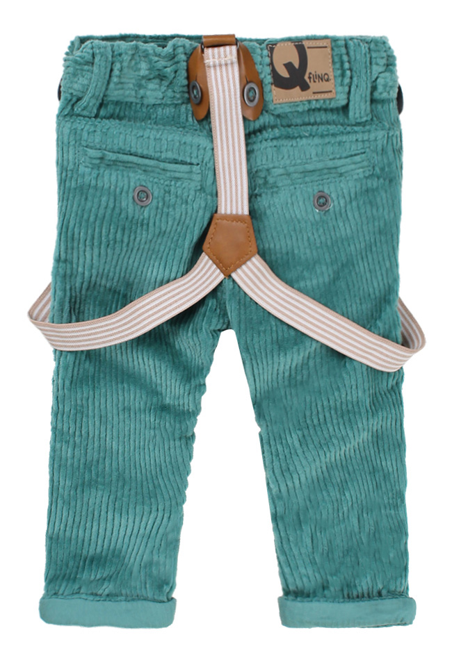 Corduroy broek met bretels. Deze broek heeft steekzakken aan de voorkant en strookzakken met een knoopje aan de achterkant. De onderkant van de broek is omgeslagen. De tailleband heeft een verstelbaar elastiek.