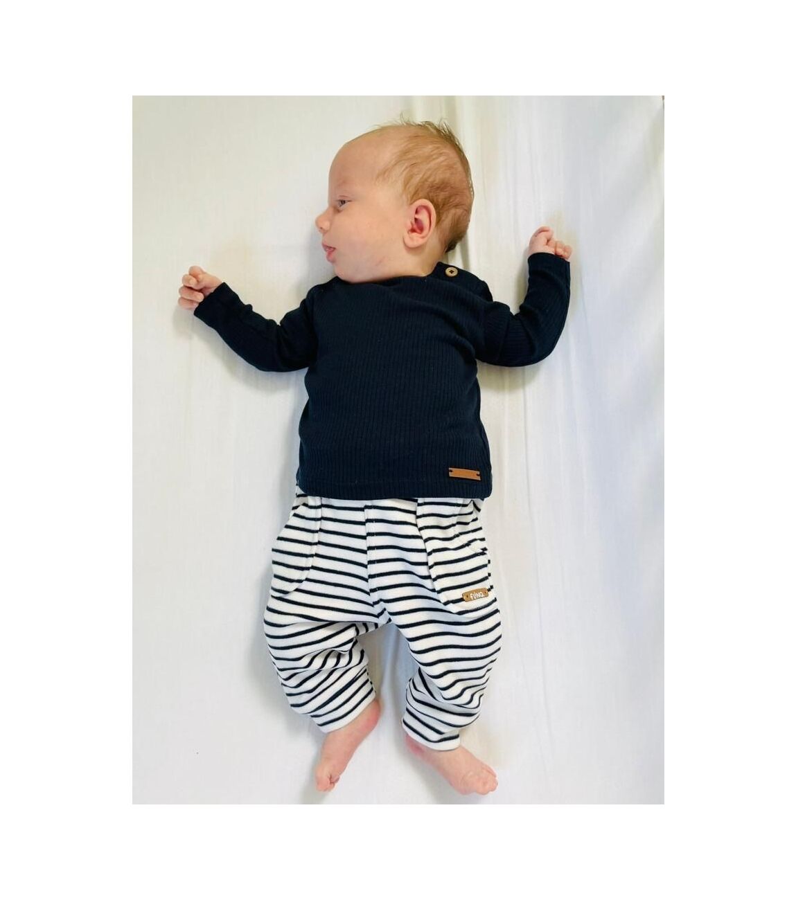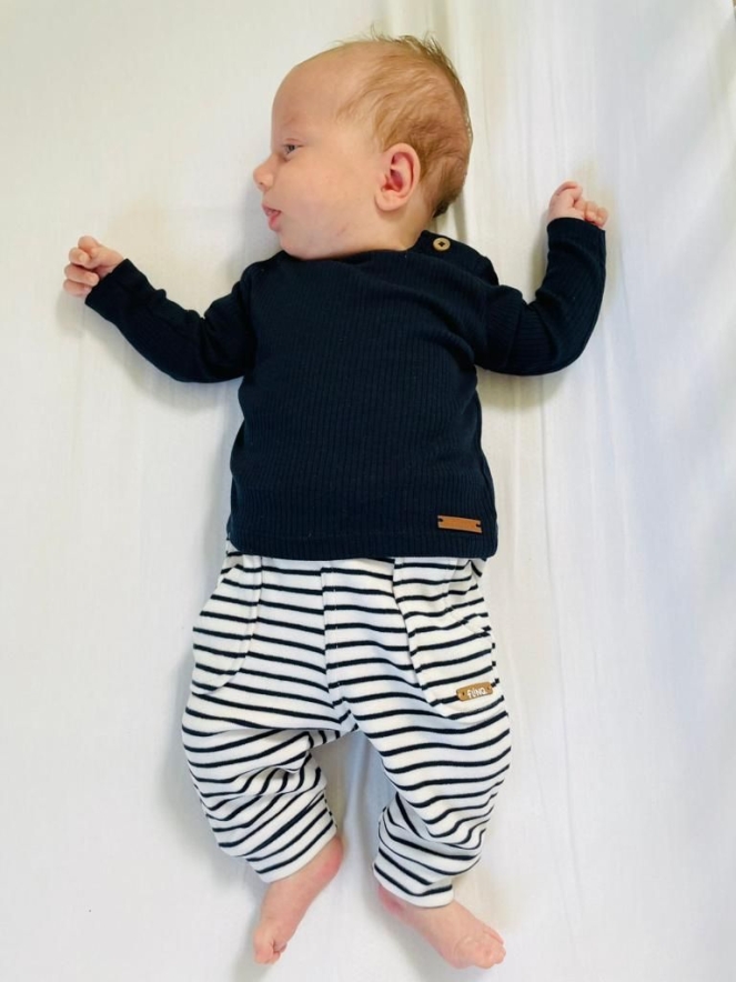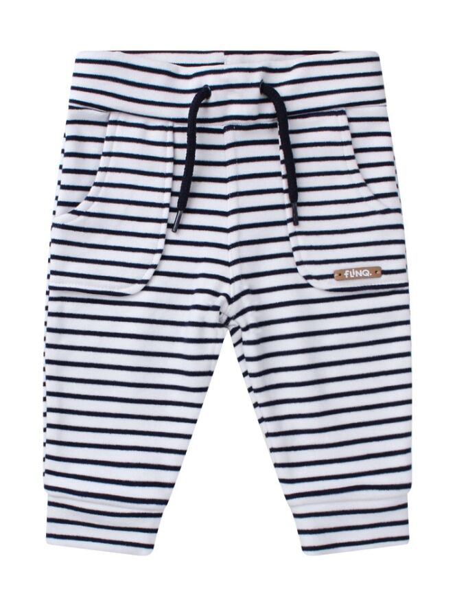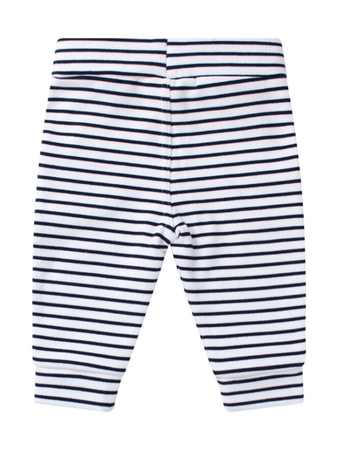 Deze schattige joggingbroek is gemaakt van een superzachte microfleece stof met een horizontaal streep motief. Op de voorkant zitten kleine opgestikte steekzakken. Het broekje heeft een elastische tailleband met sier koordje die verstelbaar is met een knoopje en elastiek aan de binnenkant. Een comfortabele en trendy broek voor de kleintjes om in te spelen en te ontdekken!