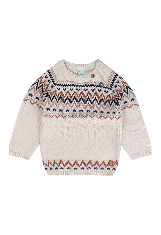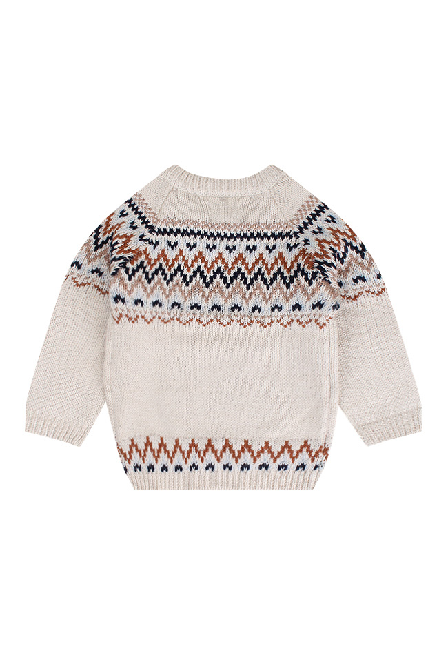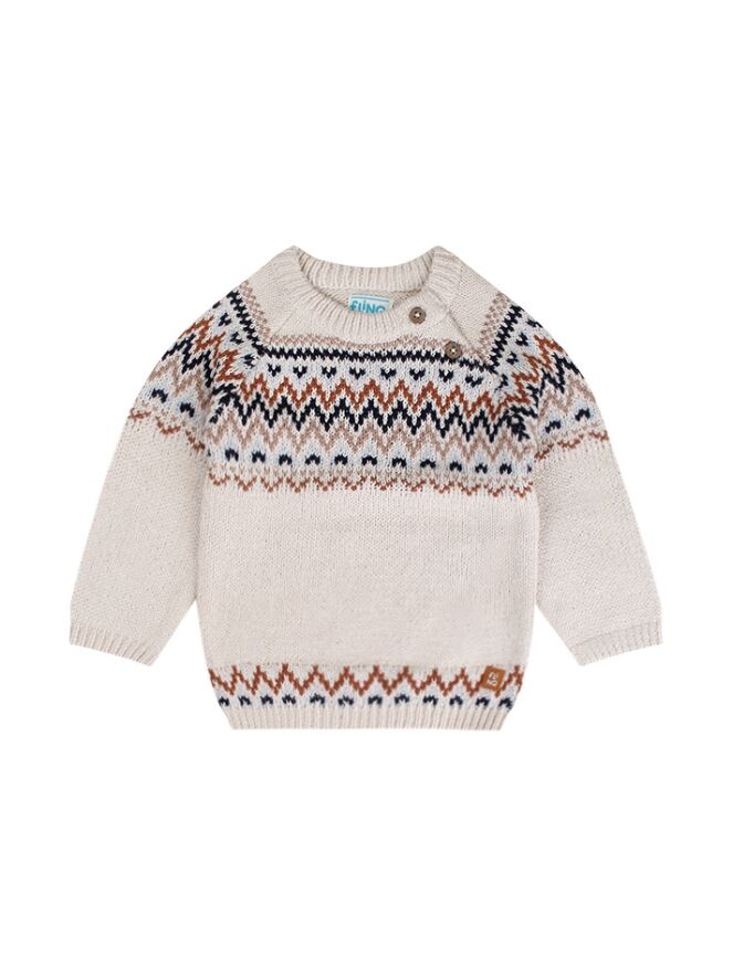 Deze trui met een ronde hals en lange mouwen heeft een ingebreid noors patroon. Op het voorpand zit een schuine sluiting met twee houtlook knoopjes voor gemakkelijk aan- en uittrekken.