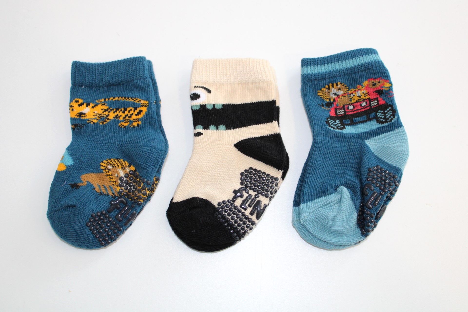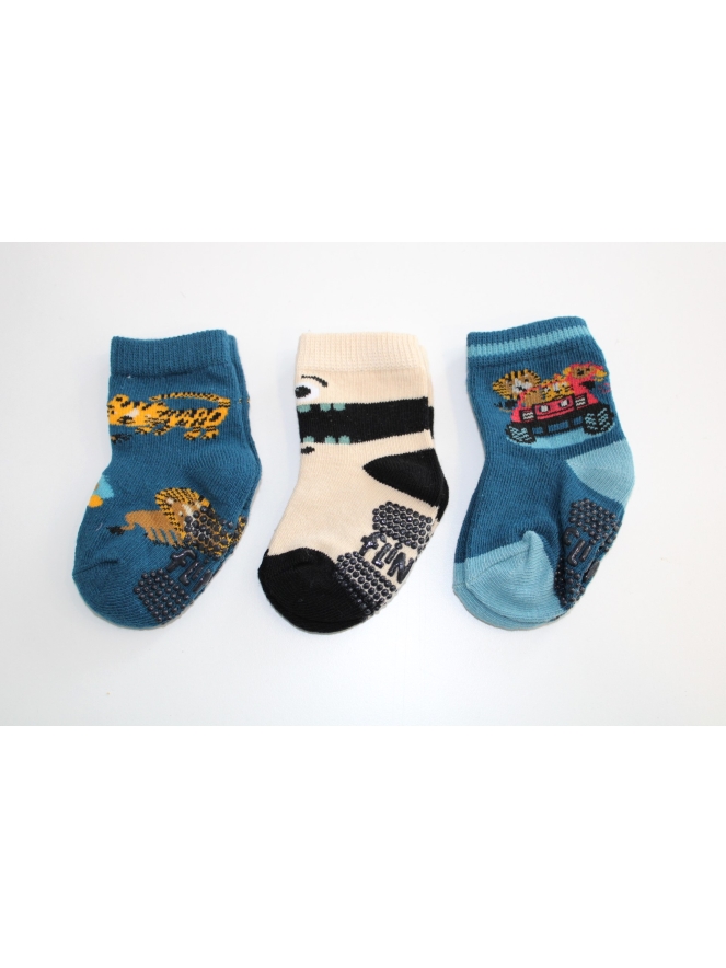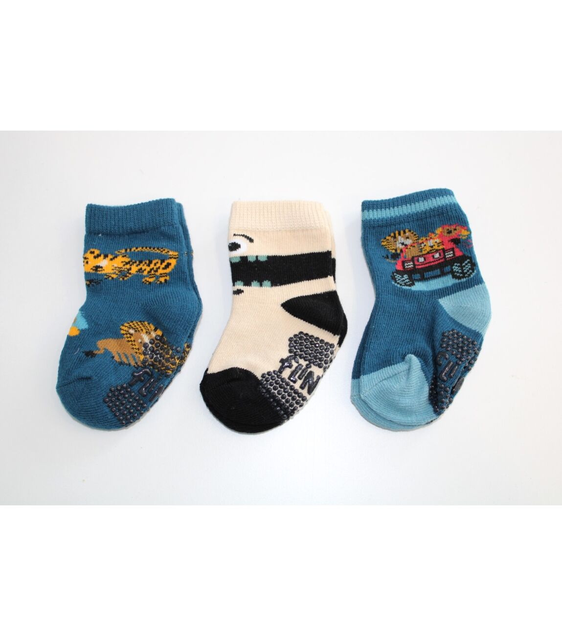 Sokken voor baby jongens verpakt per 3. Met anti slip onder de voet. Met dieren, monsters en jeeps.