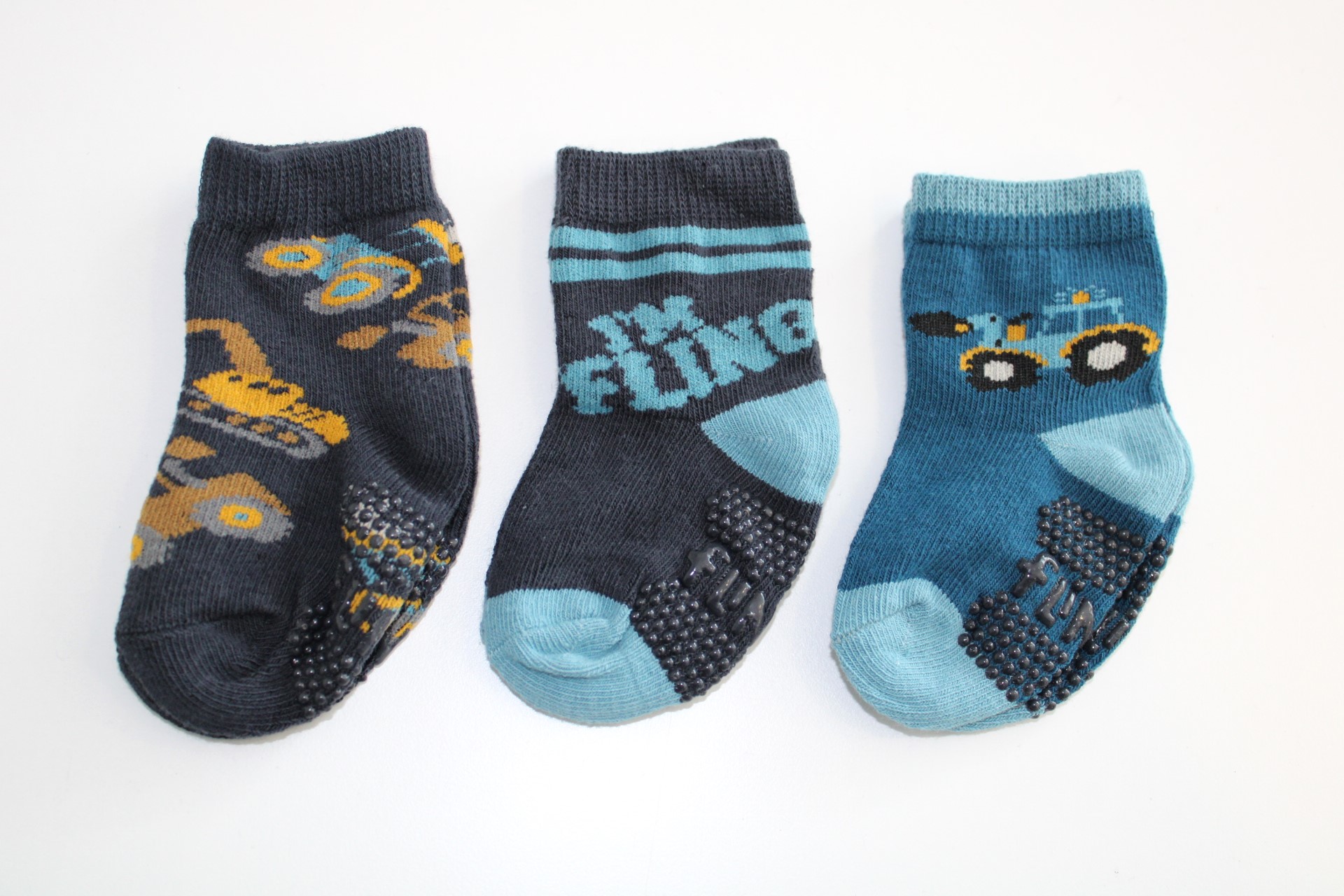 Sokken voor baby jongens verpakt per 3. Met anti slip onder de voet. Met trekkers of tekstprint.