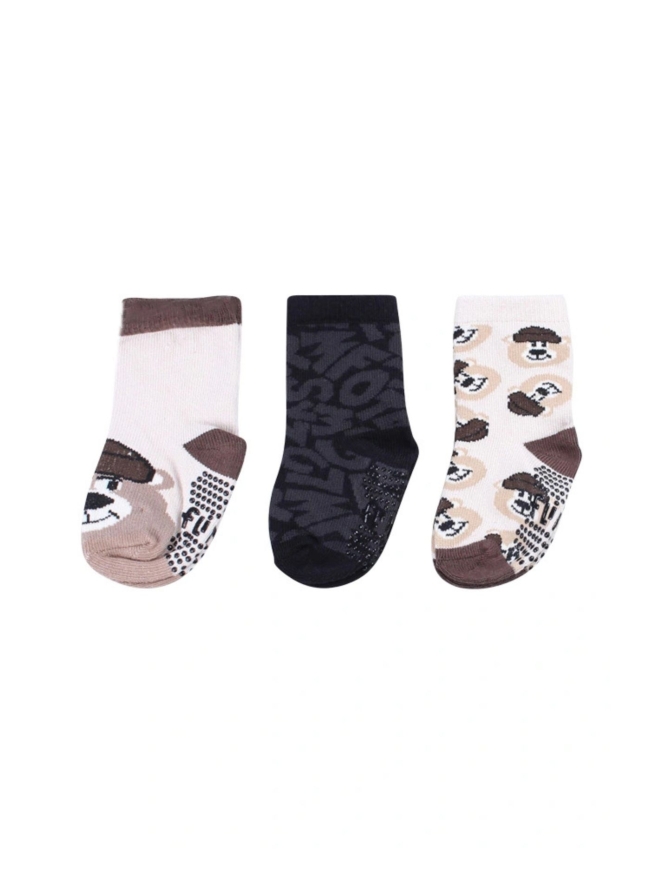Set van drie paar sokken met verschillende printjes: berenkop, letters en een all-over berenprint.