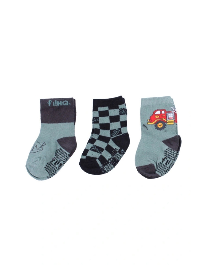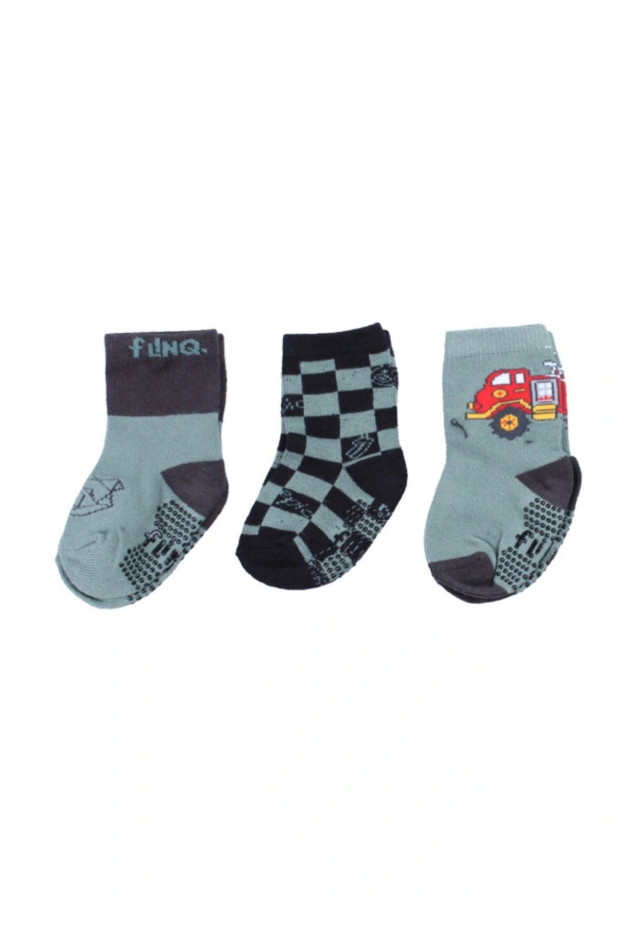 Set van drie paar sokken met verschillende printjes: grafische dierenprint, blokjes en een brandweerauto.