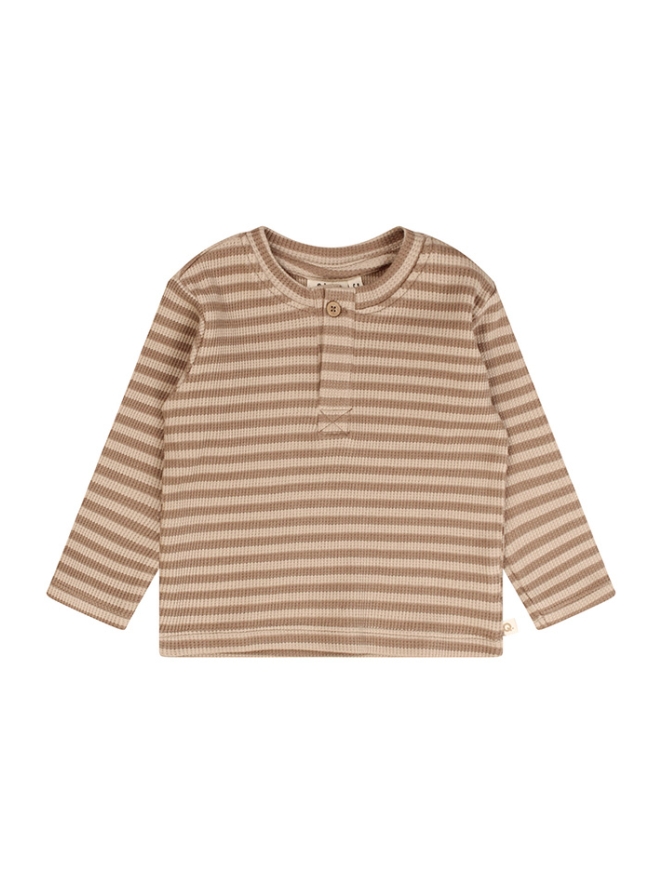 Een lief en comfortabel shirt dat perfect te combineren is met het bijpassende broekje voor een complete newborn look. Art.nr. Z10131. Het shirt is uitgevoerd in een tijdloos streeppatroon en gemaakt van biologisch katoen, waardoor het heerlijk zacht en vriendelijk is voor de gevoelige babyhuid. De wafeldoek structuur geeft het shirt een subtiele textuur en zorgt voor een luchtig, ademend draagcomfort. Het serafino model met knoopje bij de hals maakt het aan- en uitkleden extra makkelijk.