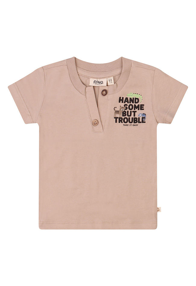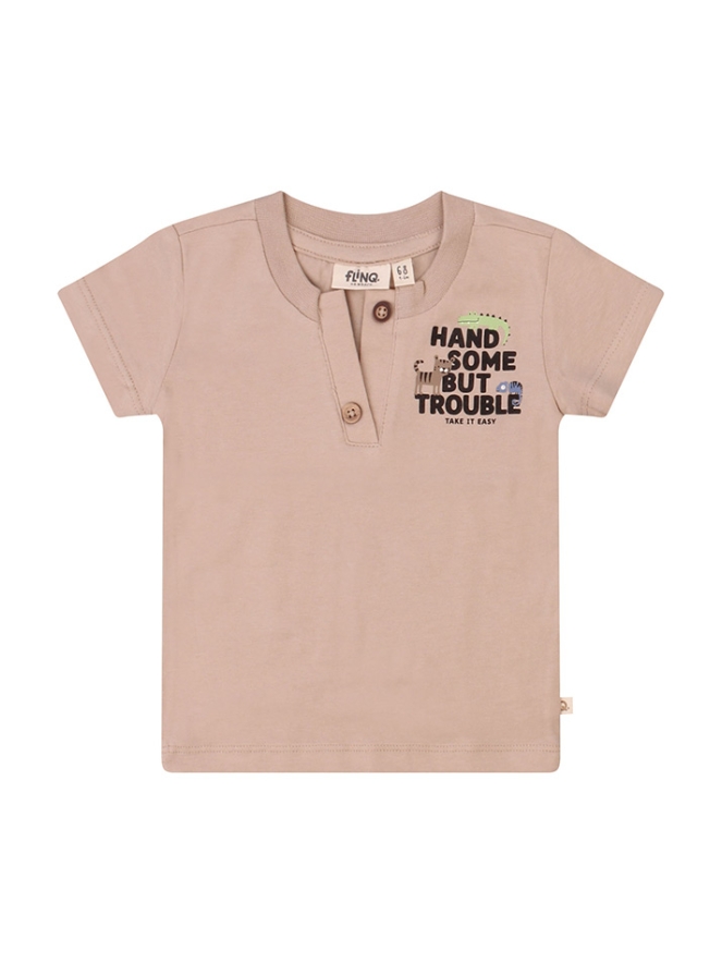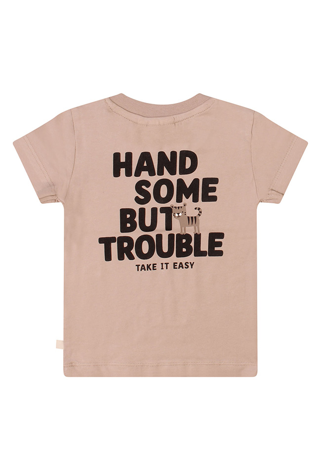 Handsome but trouble! Dit stoere T-shirtje met mooie open serafino hals heeft een leuke print voor en achterop voor kleine troublemakers!