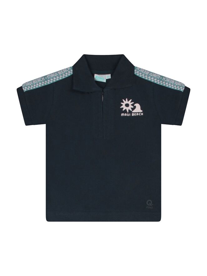 Prachtige polo voor kleine beach boys. Deze polo heeft een rits als sluiting, borduring voorop, sierbies over de arm en schouder en een bedrukking op de rug. Maui beach surfing club!