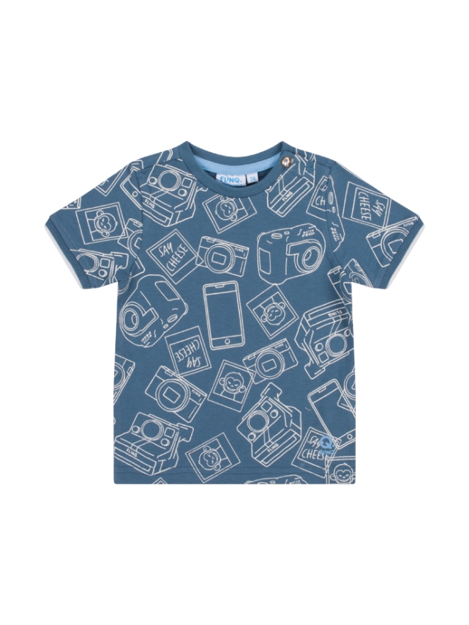 T-shirt van FlinQ. Het t-shirt heeft een all over print van fototoestellen en foto's. De mouwen hebben een gestreept boordje. Materiaal: 95% katoen, 5% elasthan. Wassen op 30 graden, niet bleken, niet in de droger, niet strijken.