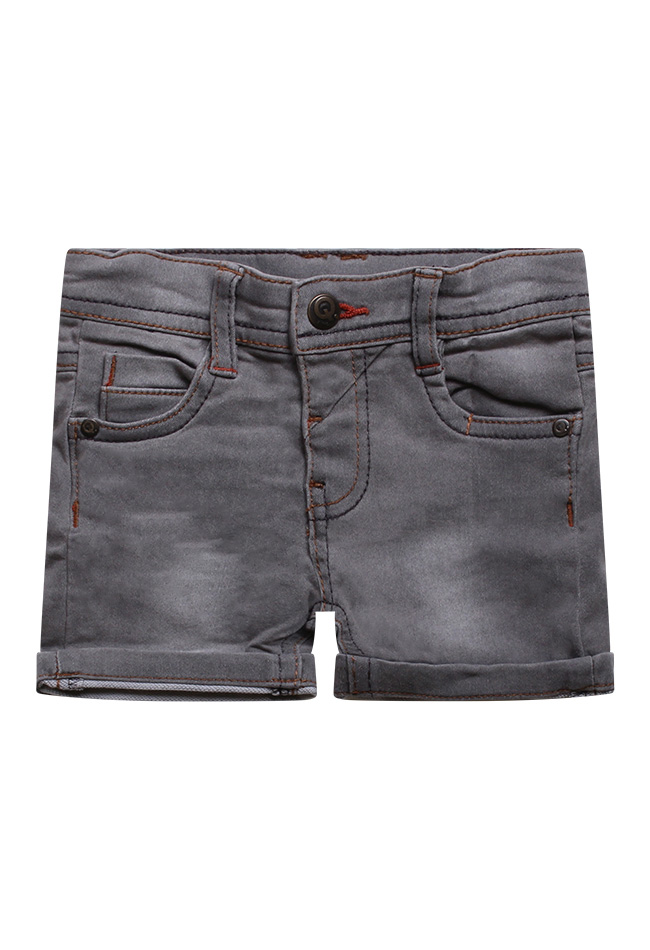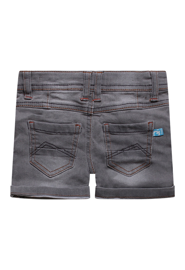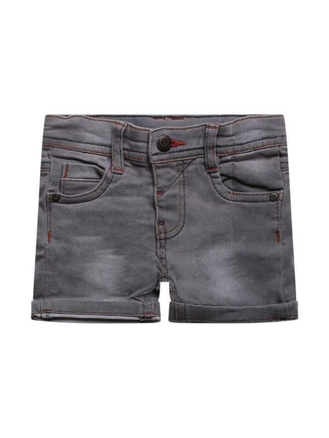 Five pocket short met in de tailleband een elastiek om de taille strakker te maken. De short heeft een schuif knoop sluiting en een omslag onder aan.