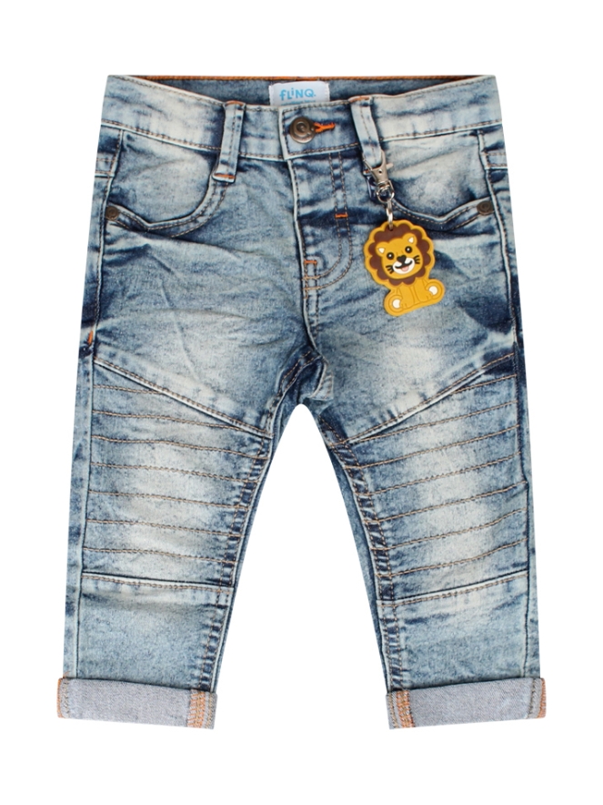 Dit stoere jongens broekje heeft een omslag en is een 5 pocket model. met verstelbare tailleband en veel stretch. Bij dit broekje zit een sleutelhanger met leeuw.