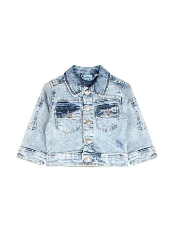 Dit stoere spijkerjasje voor baby jongens heeft leuke details zoals een bleached look, klepzakjes, opgestikte denim op de mouw en drukknoopjes die aan de buitenkant op gewone knopen lijken.