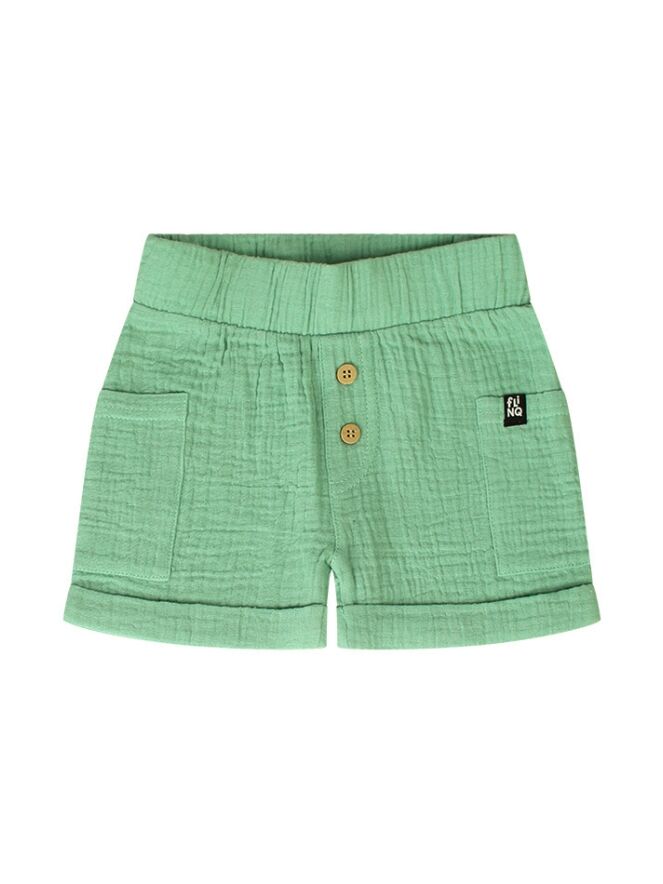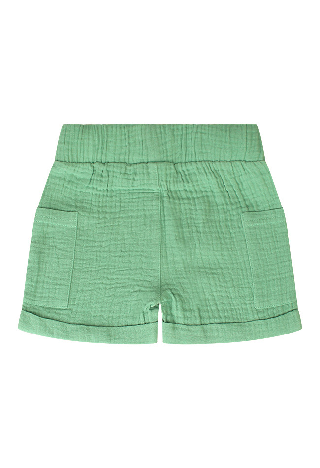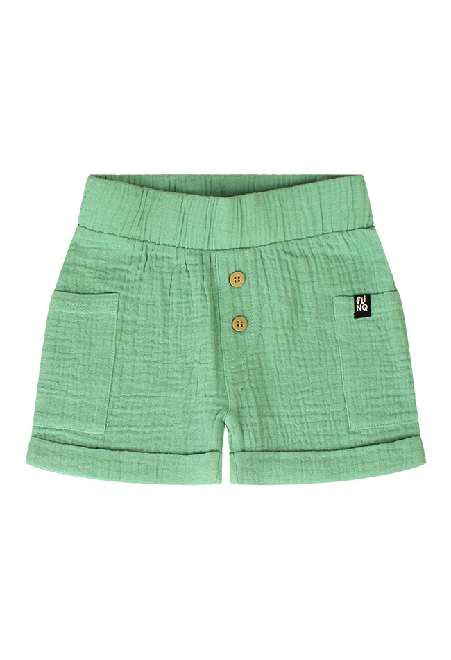 Deze short van linnen heeft een omgeslagen pijp, twee zijzakken en knoopjes op de gulp. De elastische tailleband is verstelbaar aan de binnenkant.
