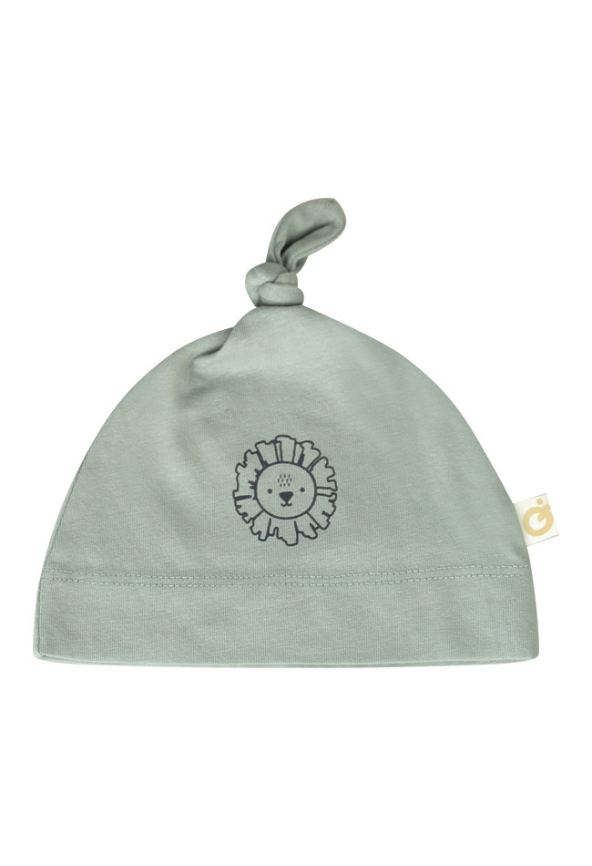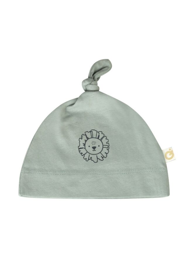 Dit new born knoop mutsje heeft een kleine afbeelding van een leeuw op de voorkant.