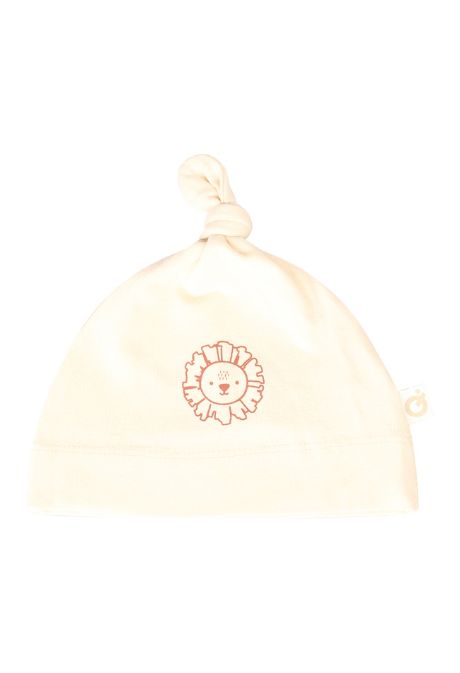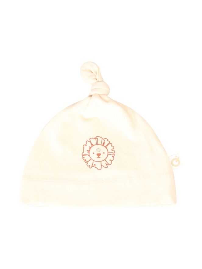 Dit new born knoop mutsje heeft een kleine afbeelding van een leeuw op de voorkant.