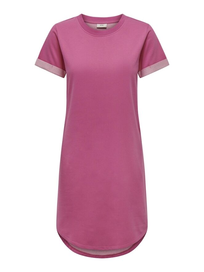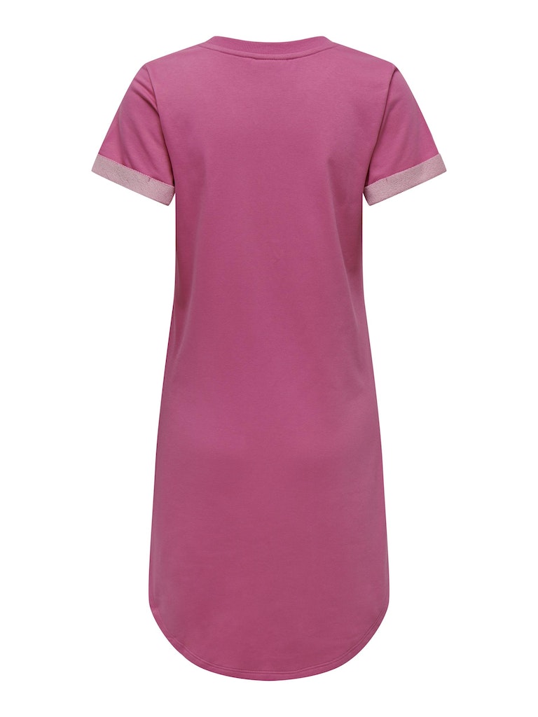 Dit T-shirt jurkje heeft een recht model met ronde afwerkingen. De jurk is van sweat stof en valt losjes op maat.
