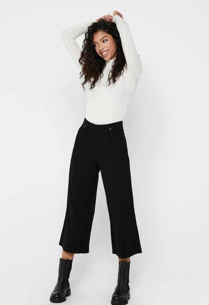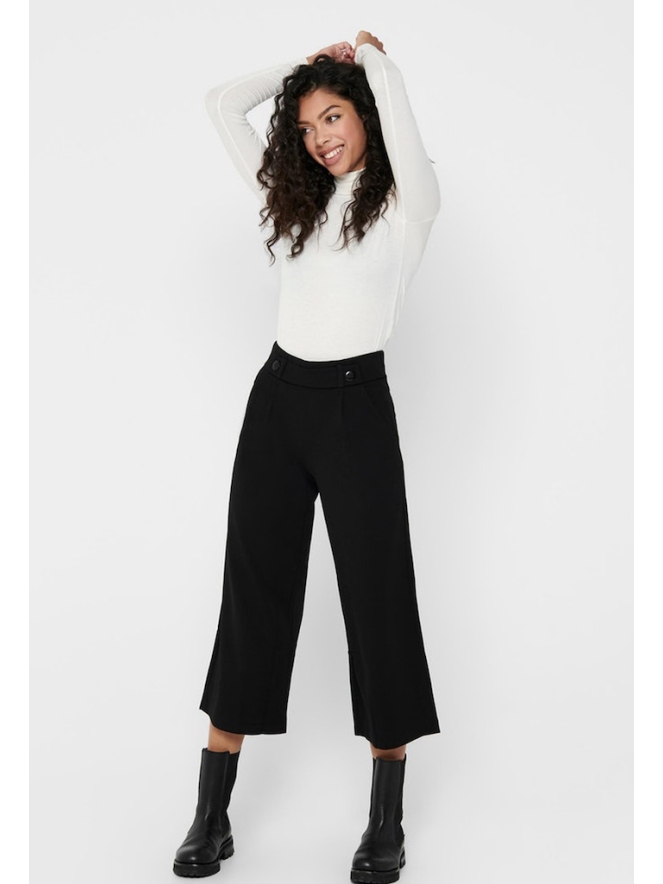 Nette pantalon van JDY. De broek heeft wijde pijpen en een hoge taille. Er zit elastiek in de taille en sier knopen. Valt op maat. Materiaal: 95% polyester, 5% elasthan. Wassen op 30 graden, niet bleken, niet in de droger, kan gestreken worden.