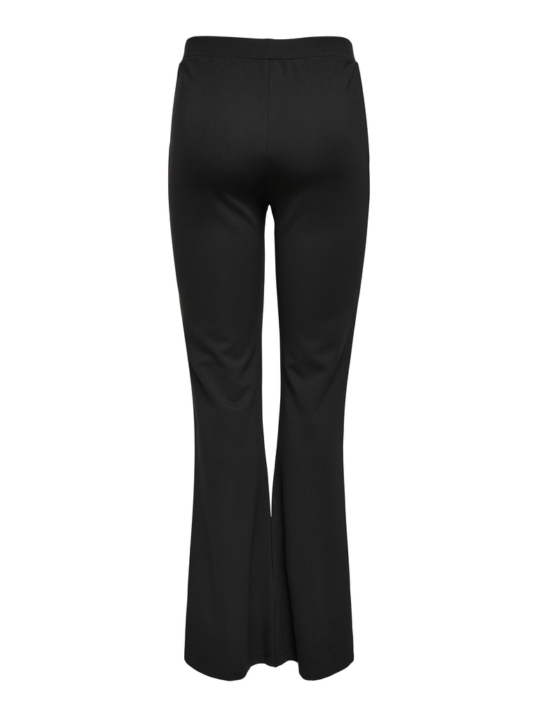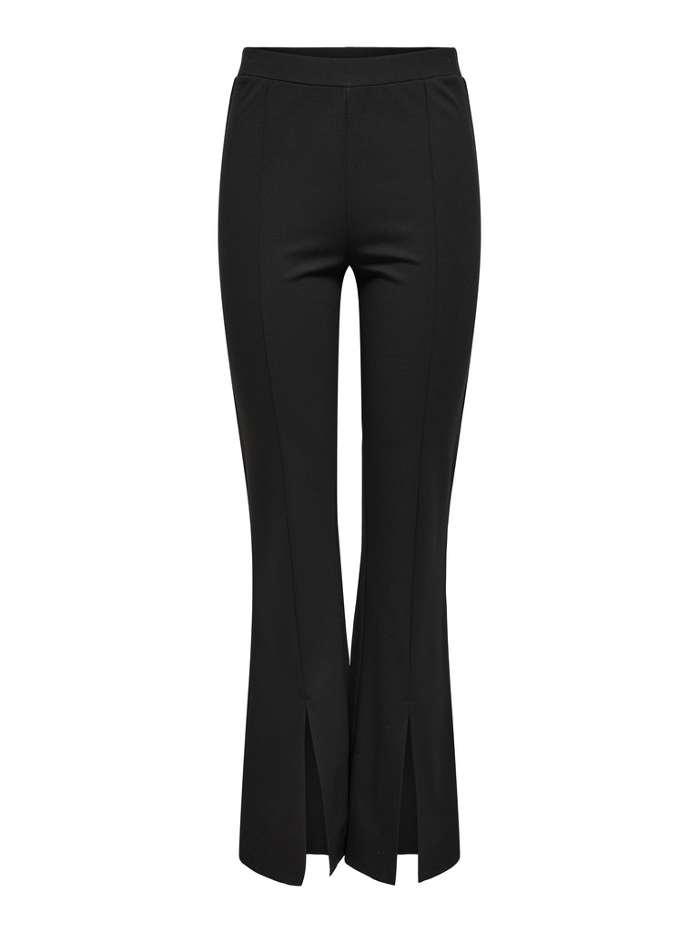 De broek is van zachte rekbare stof en heeft flairpijpen met een split op de voorkant. De broek heeft een elastieken taille.