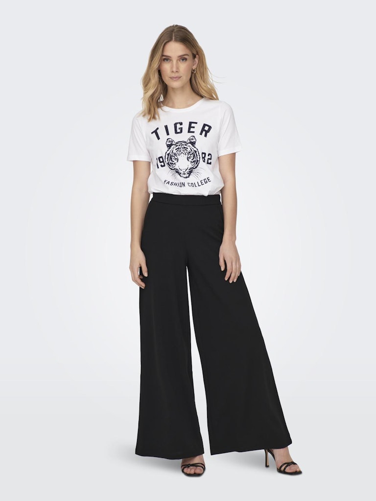 Nette zwarte pantalon broek met wijde pijpen, steekzakken en een elastische inzet achter in de tailleband. Te combineren met iedere sweater of lekkere warme trui! Musthave in jouw garderobe.