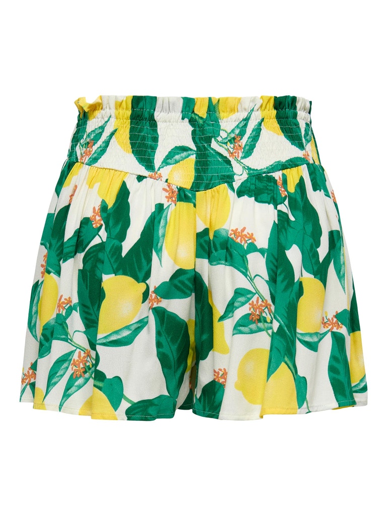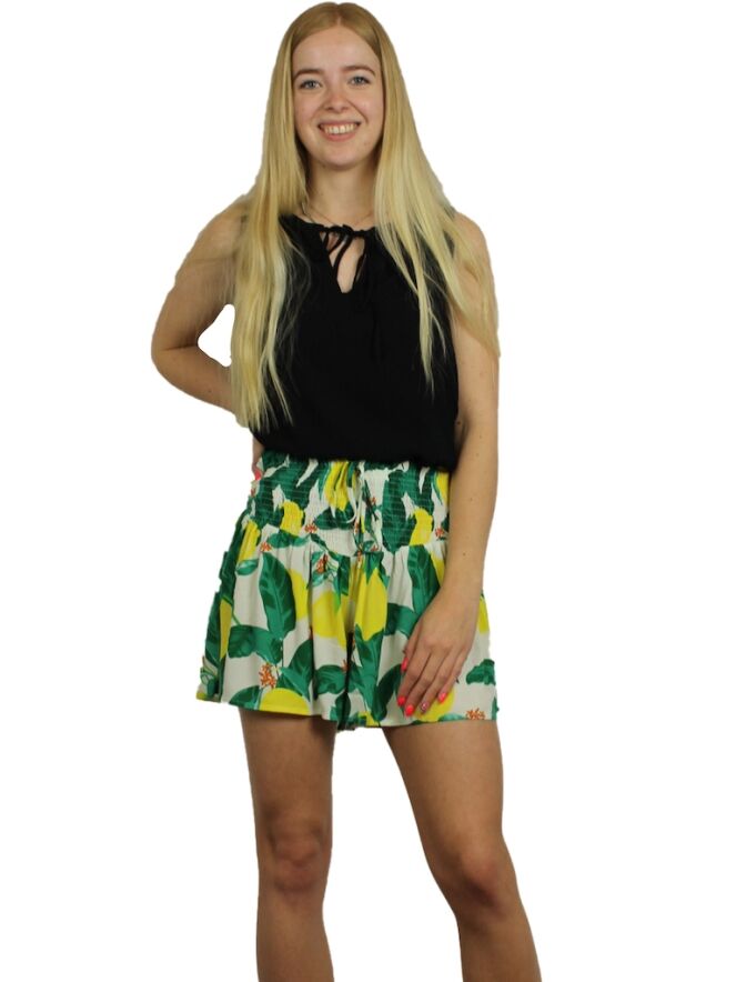 Flowy shorts van JDY. De shorts lijkt een rokje. Het heeft een smock taille band met touwtje. De shorts heeft een all over blad/citroen print. Valt op maat. Materiaal: 100% viscose. Wassen op 30 graden, niet bleken, niet in de droger, kan gestreken worden.