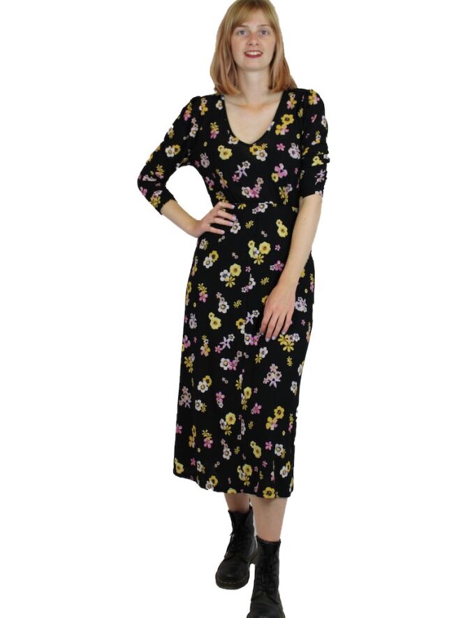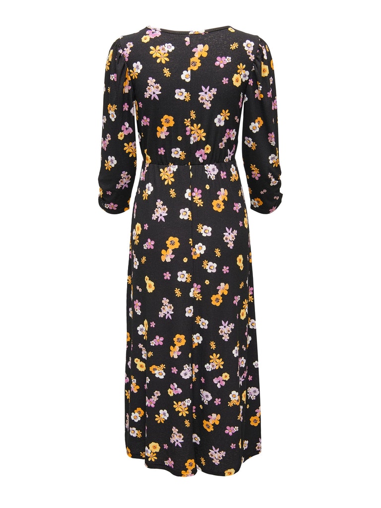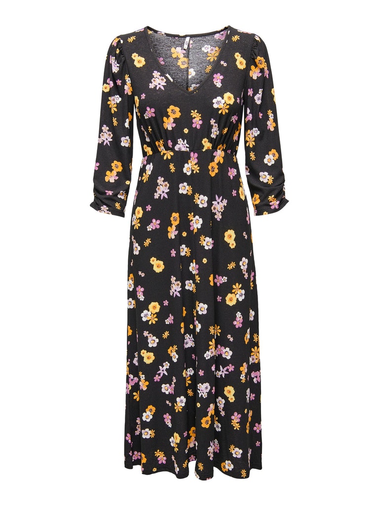 Midi jurk van JDY. De jurk heeft een lange lengte en lange mouwen. De jurk heeft een bloemen print en is van rekbare rib stof. Valt op maat. Materiaal: