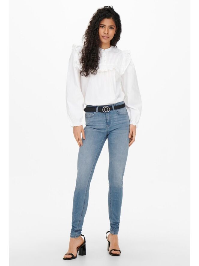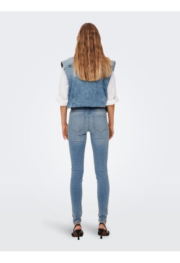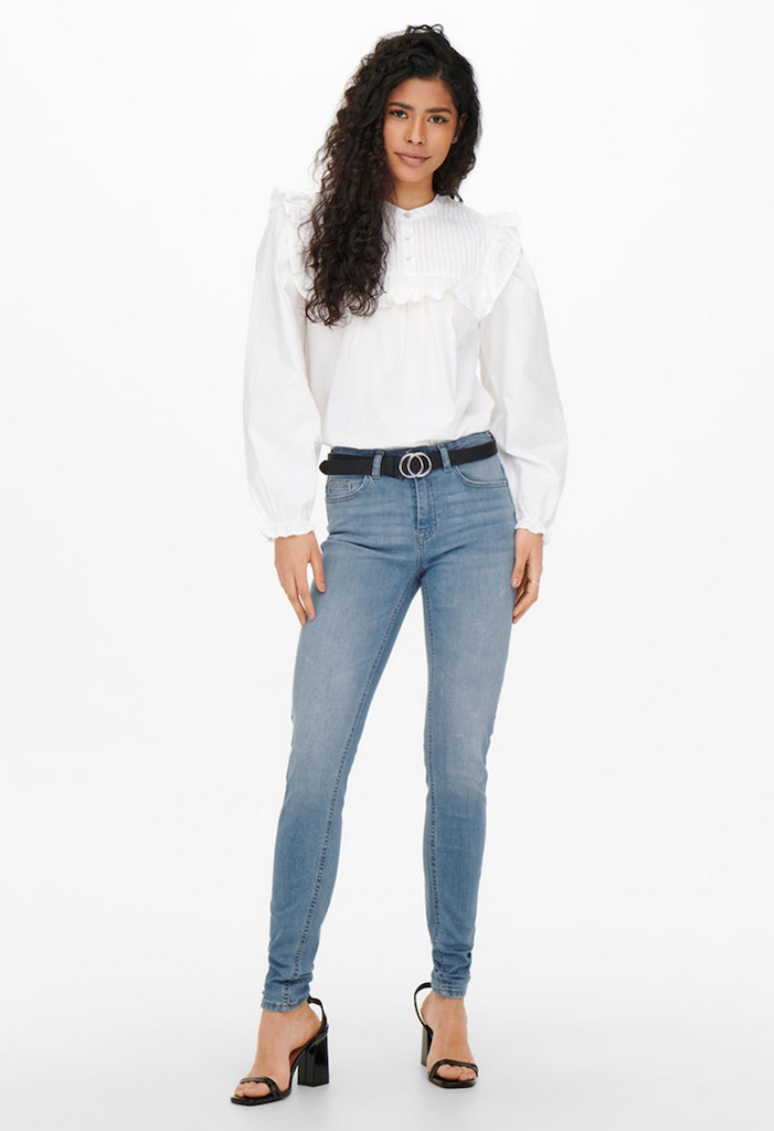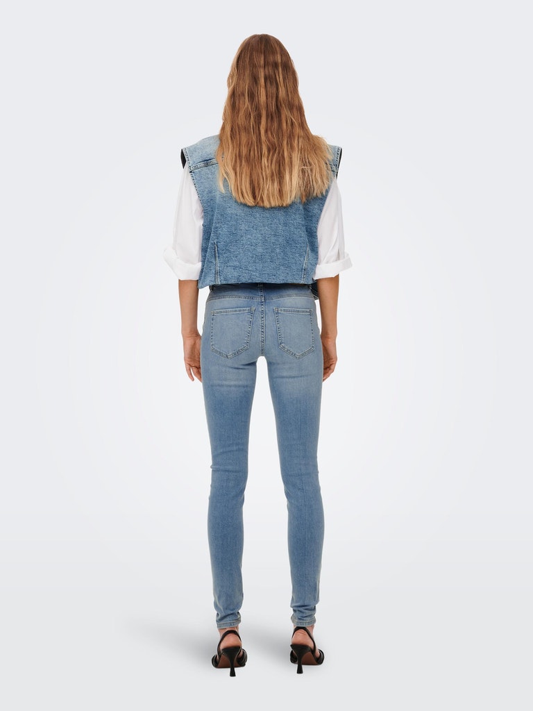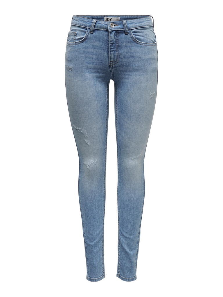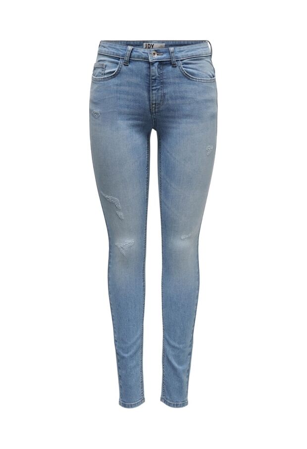 Deze Skinny jeans heeft een licht blauwe wassing en kleine destroyed plekken. De jeans valt lang en heeft een normale taille hoogte.