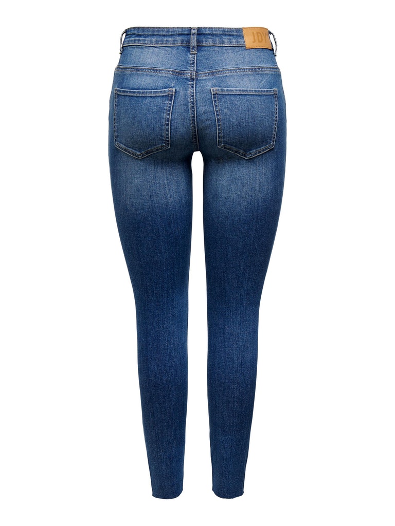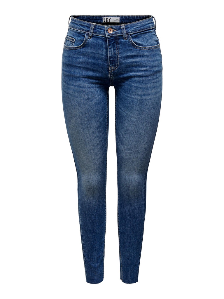 Skinny jeans van JDY. Deze Skinny jeans heeft een medium blauwe wassing. De jeans heeft een lengte tot aan de enkel met een onafgewerkte zoom en een normale taille hoogte.