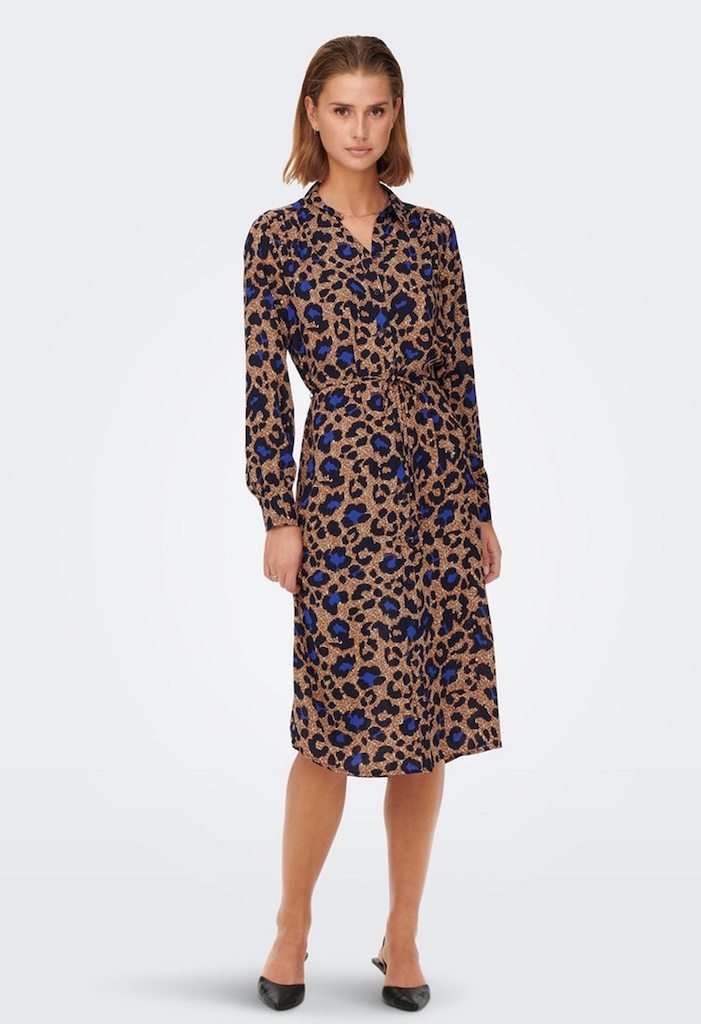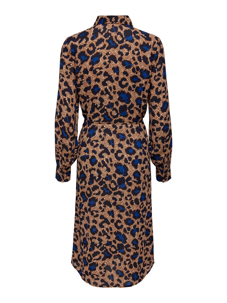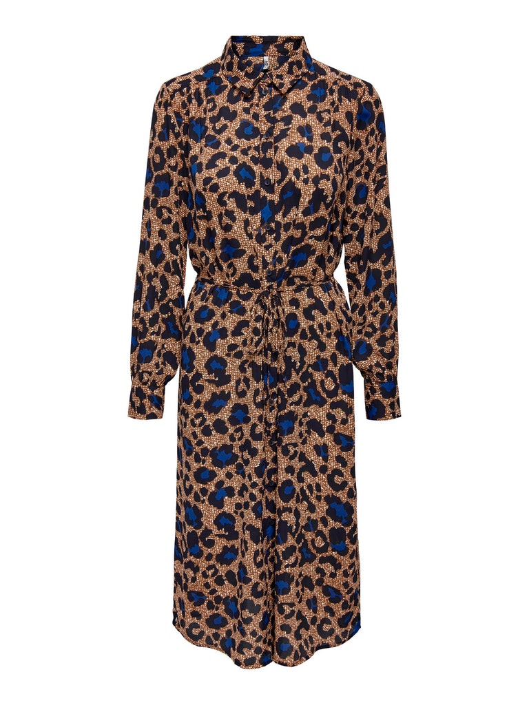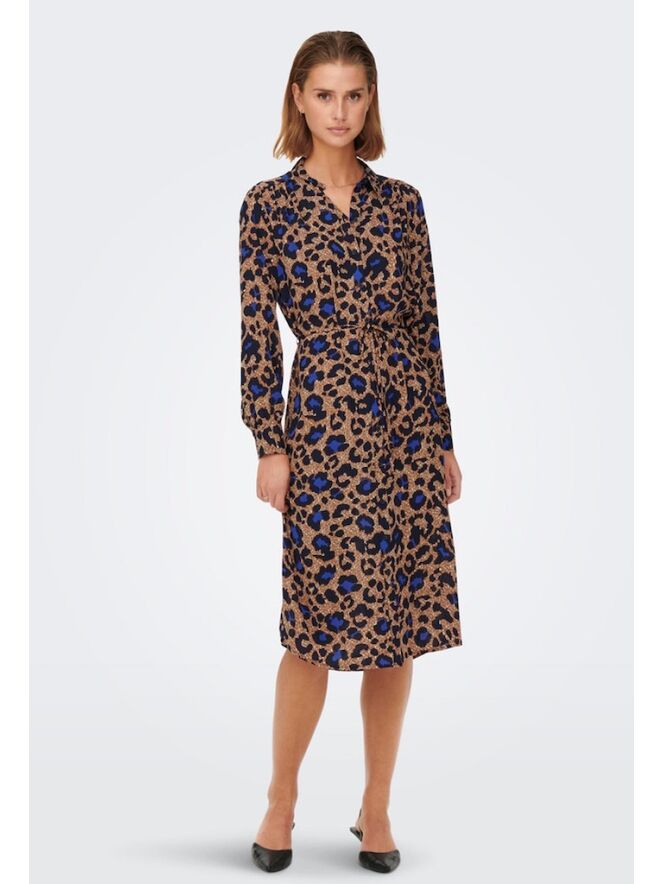 Midi jurk met een allover print en blouse model, er zit een strikje in de taille. Valt op maat.