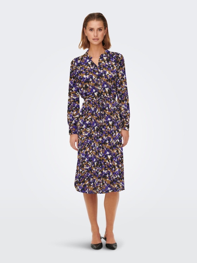 Midi jurk met een allover print en blouse model, er zit een strikje in de taille. Valt op maat.