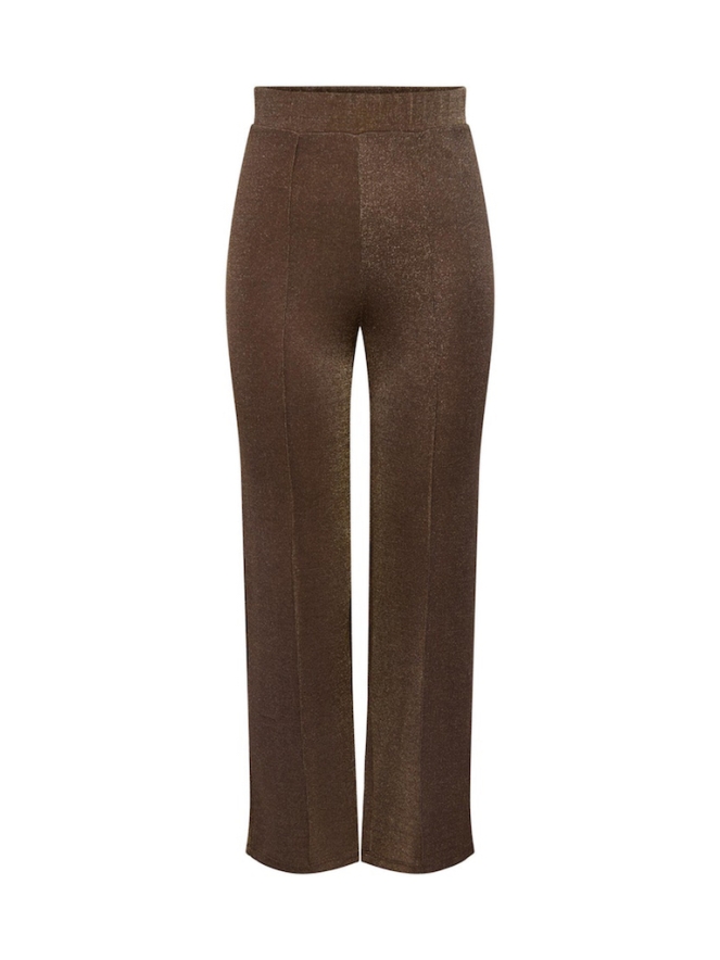 Glitter broek van JDY. Deze bruin kleurige broek heeft een feestelijke uitstraling door het glinsterende gouden lurex draad dat door de broek heen is gebreid. De broek heeft een rechte pijp en voor over het been loopt een plat gestikte naad. De broek is gemaakt van een rekbaar materiaal en de tailleband is elastische.