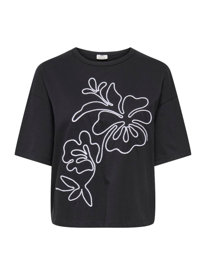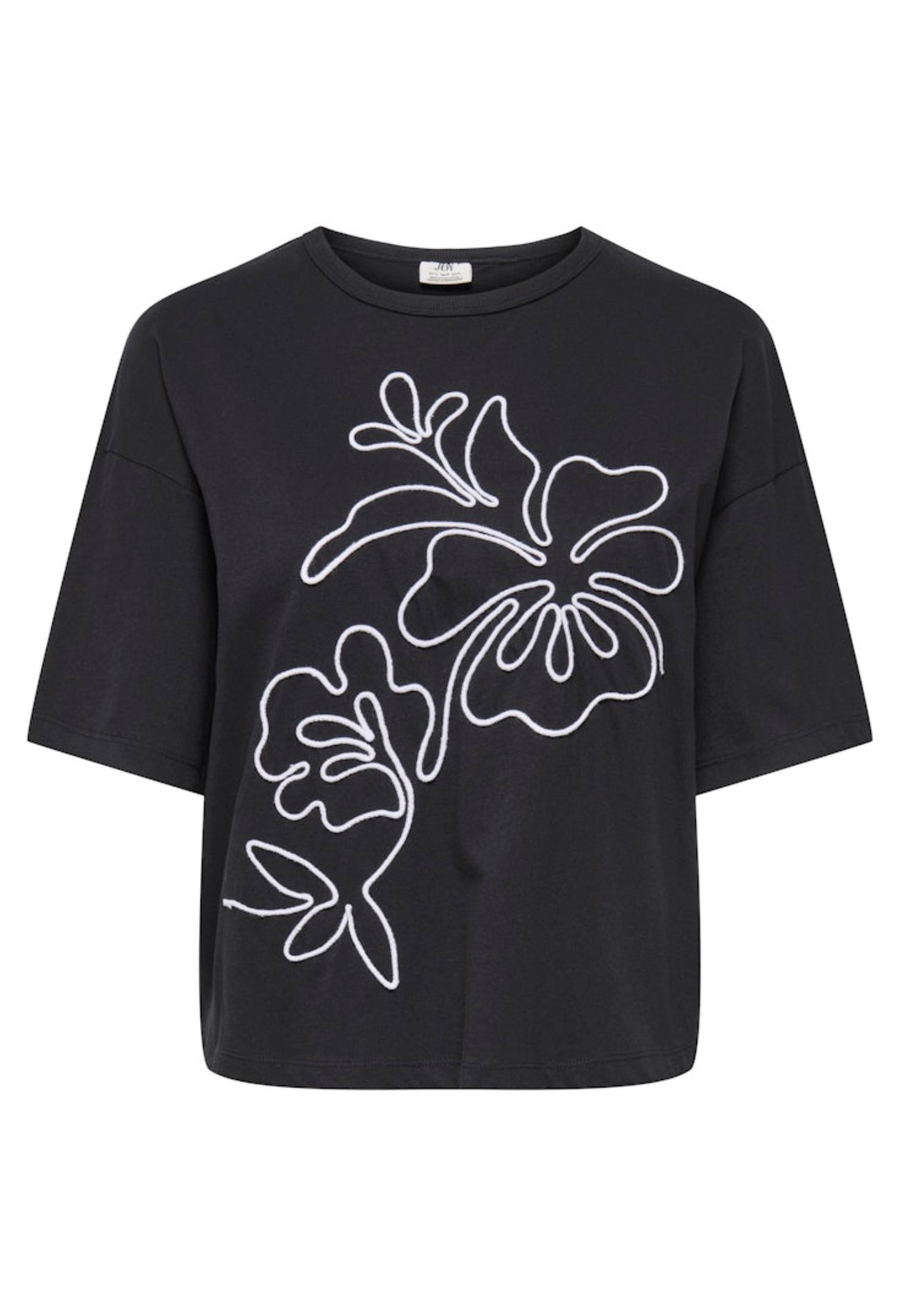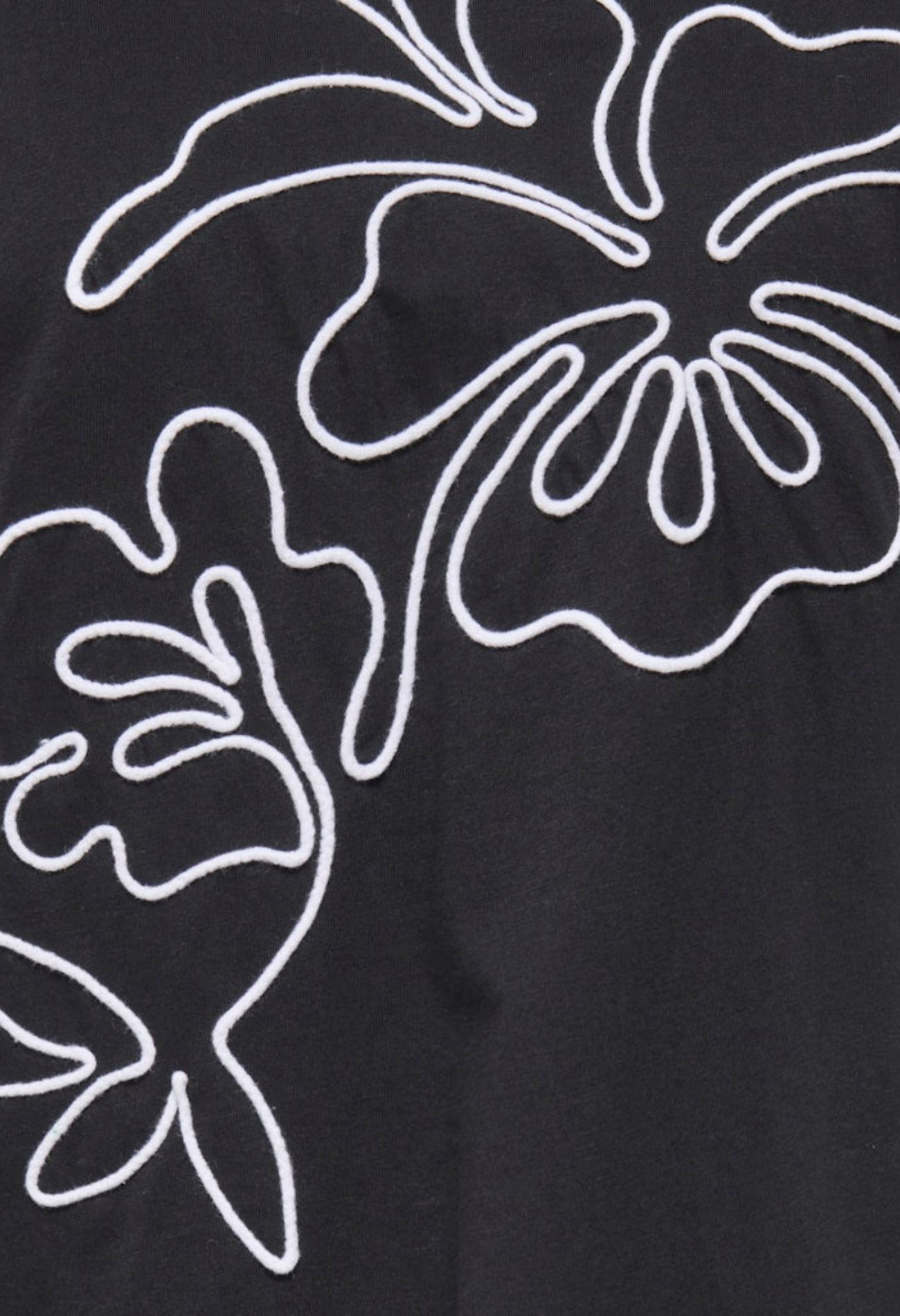 Dit T-shirt met een wide fit heeft een prachtig bloemmotief van een opgestikt koord. Makkelijk te combineren met jeans of een mooie zwarte pantalon.
