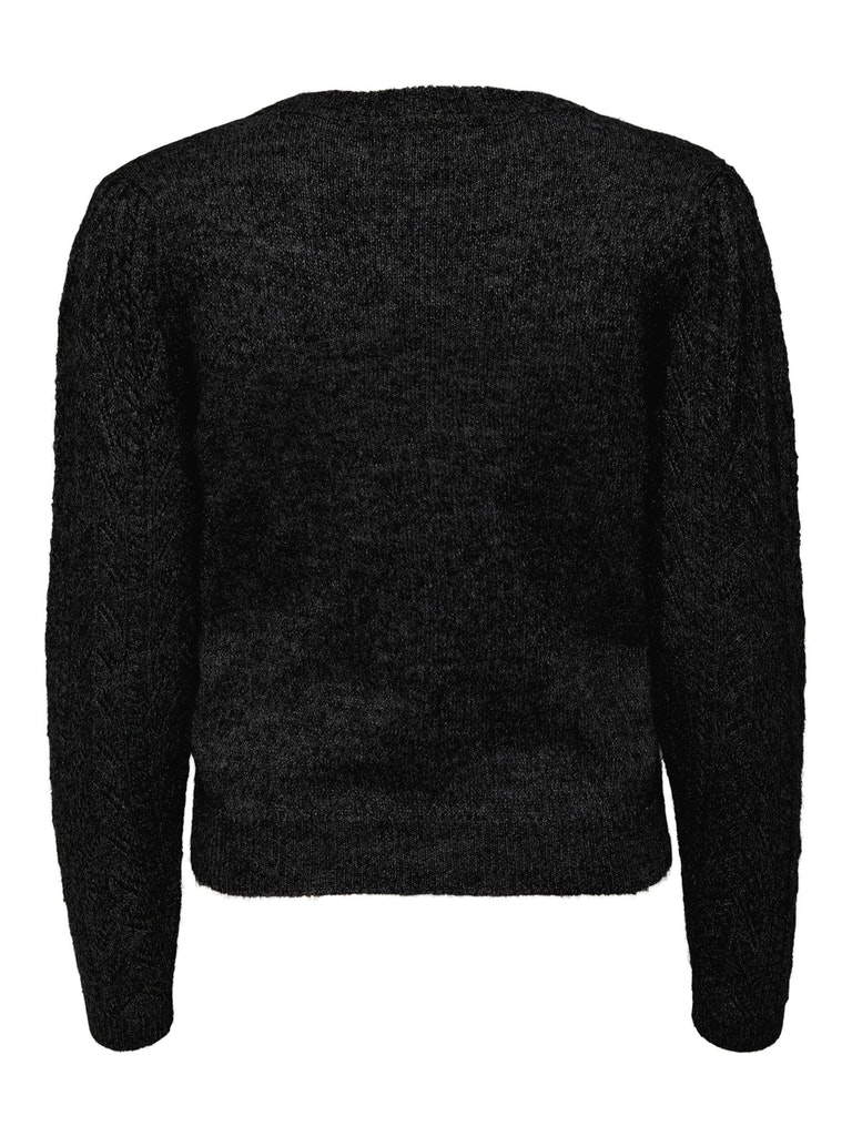 Gebreide trui van JDY. De trui heeft een gaten brei patroon en glitters er doorheen. Valt op maat. Materiaal: 45% gerecycled polyester, 21% acrylic, 16% polyester, 15% metallic, 3% elasthan. Wassen op 30 graden, niet bleken, niet in de droger, kan gestreken worden.
