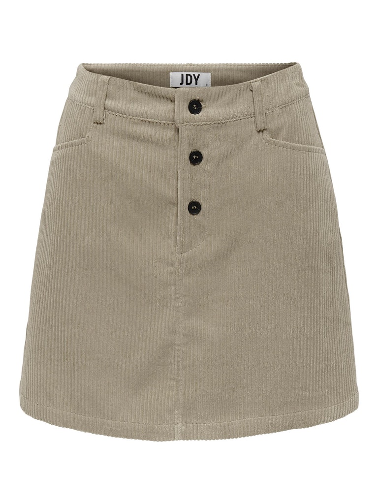 Corduroy rok van JDY. Perfect voor een jaren 70 look! Deze korte A-lijn rok zit hoog in de taille en loopt iets weider uit. Aan de voorkant zitten twee steekzakken en rond de tailleband zitten riemlussen. De voorkant word gesloten met een knoopsluiting.