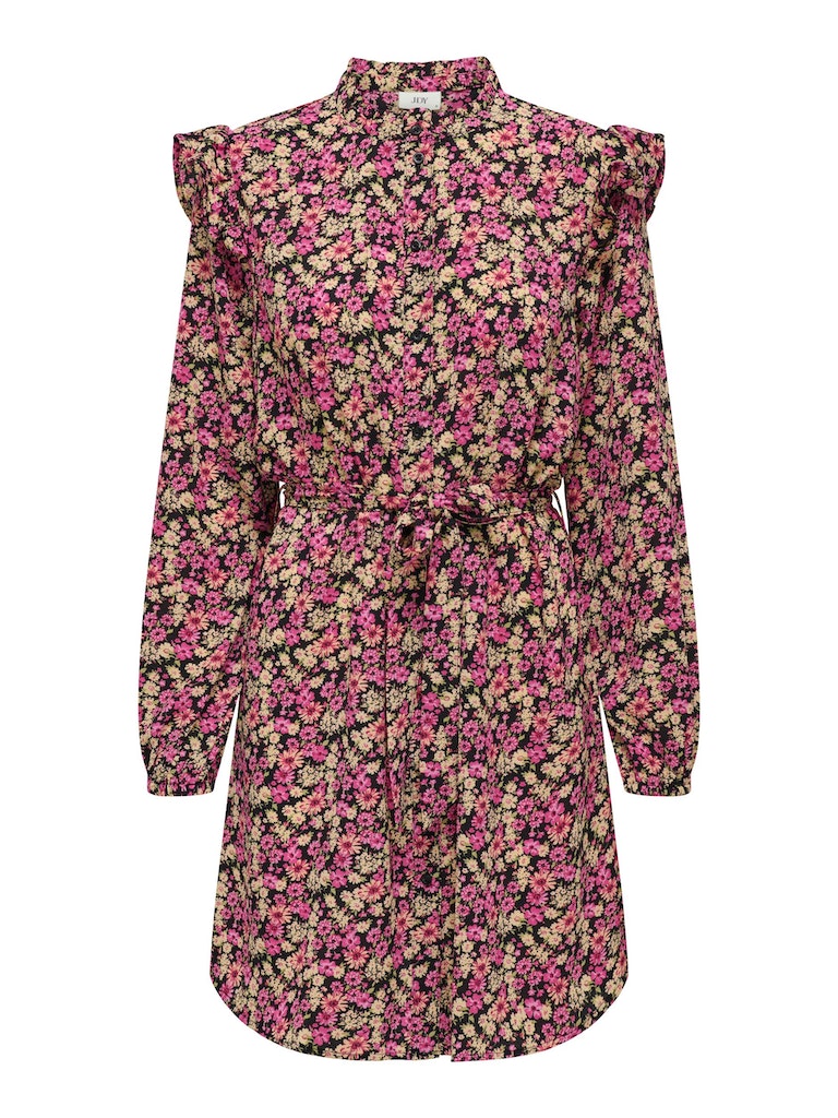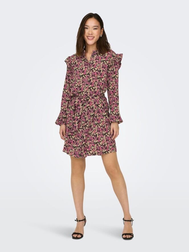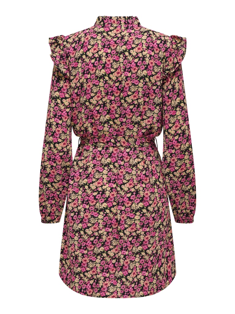 Gebloemd jurkje met knoopsluiting tot onder aan toe en een strikceintuur. De hals is rond, rond de hals en op de shouders zitten ruches.