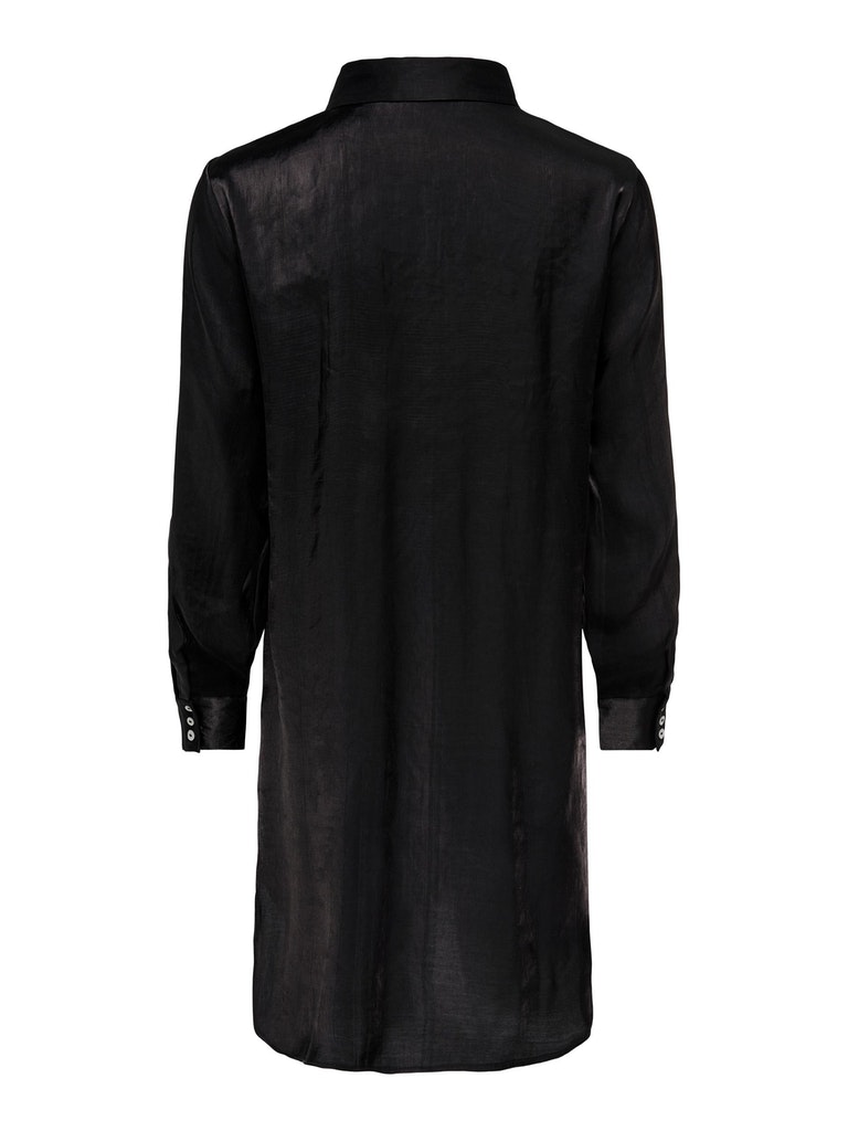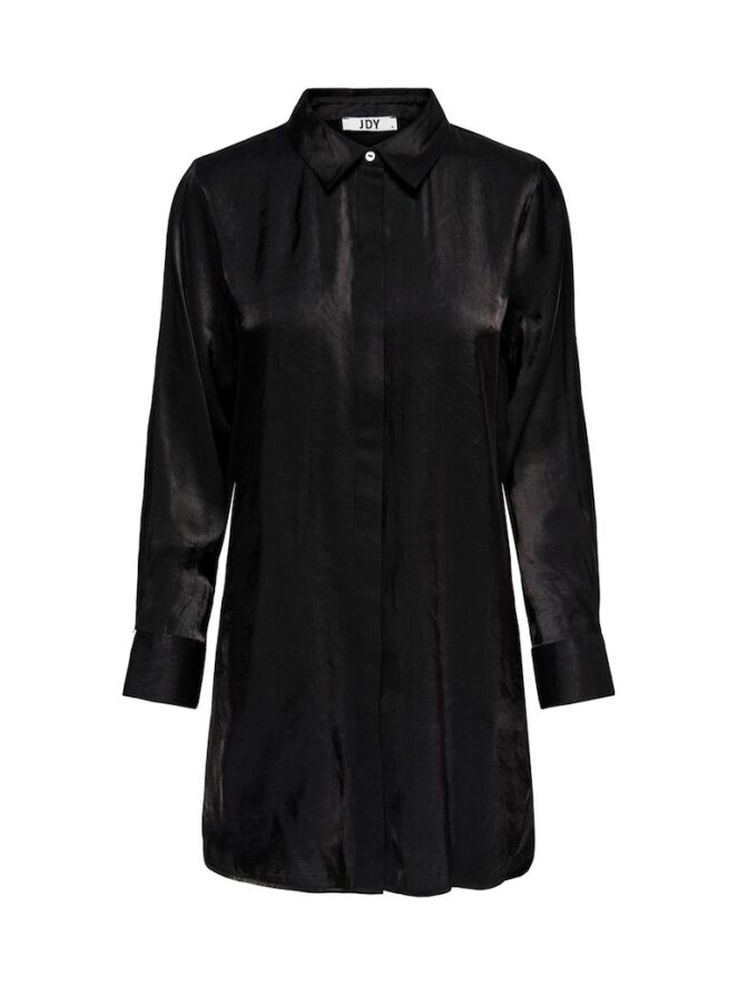 Blouse van JDY. Deze blouse heeft normale kraag en lange rechte mouwen met drie knopen op de manchet. De blouse valt lang en is gemaakt van een glanzende stof waardoor hij een luxe uitstraling heeft.