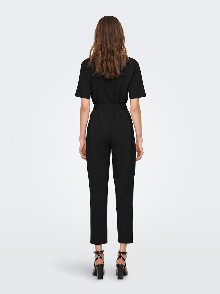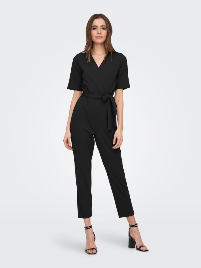 Deze jumpsuit heeft korte mouwen en een overslag V-hals. De taille is elastisch en daarover heen een strikdetail.