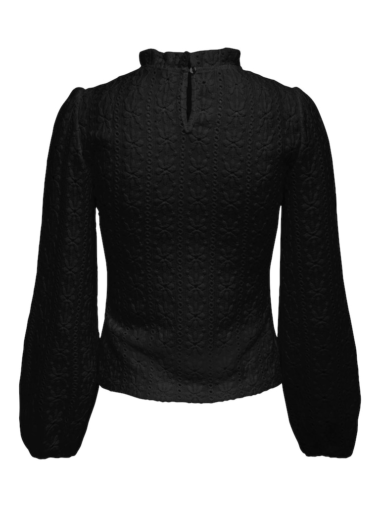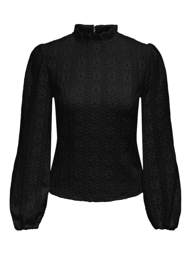 Shirt met lange mouw en ruche rond de kraag. Dit shirt is gemaakt van ajour stof en is dus doorschijnend door het bloempatroon.