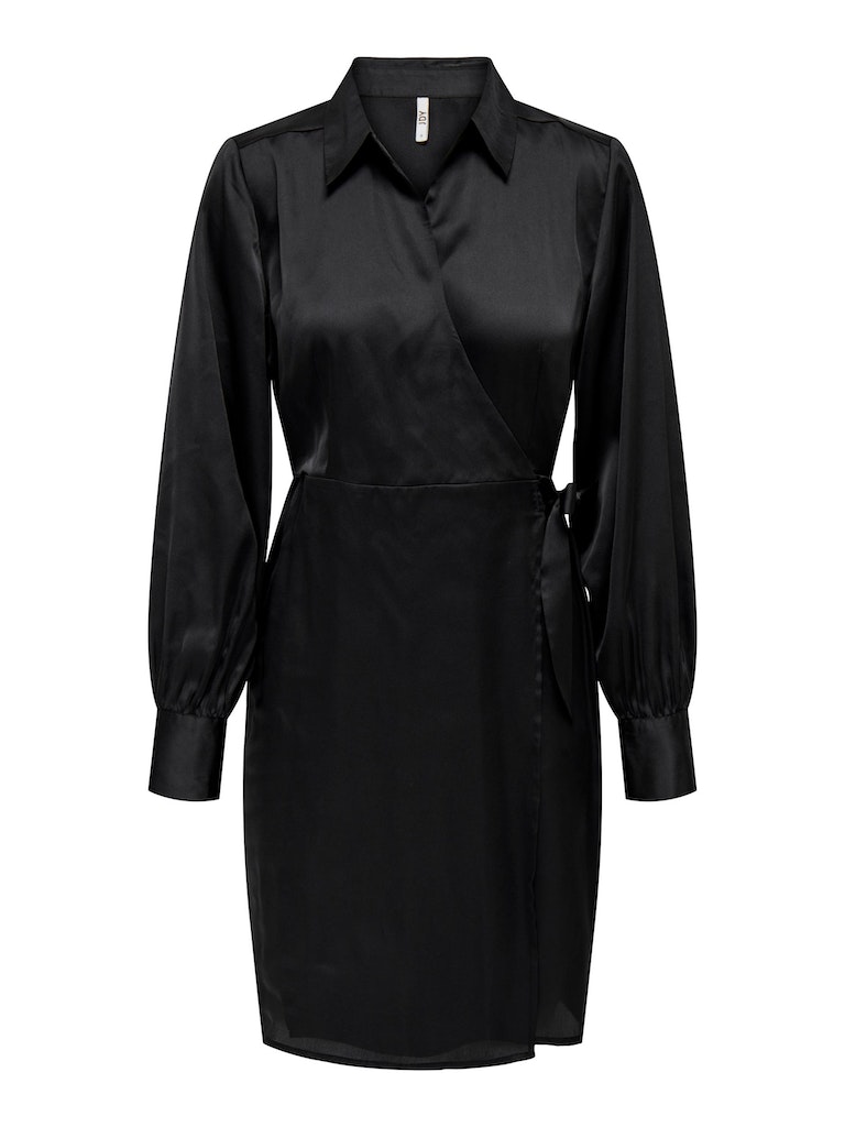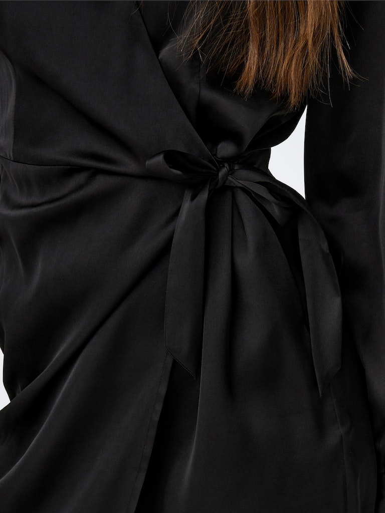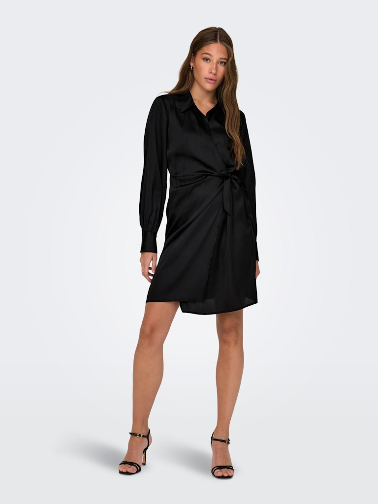 Deze wrap jurk heeft een satijnen look met een strikceintuur en reverskraag. De lengte van deze jurk is middellang.