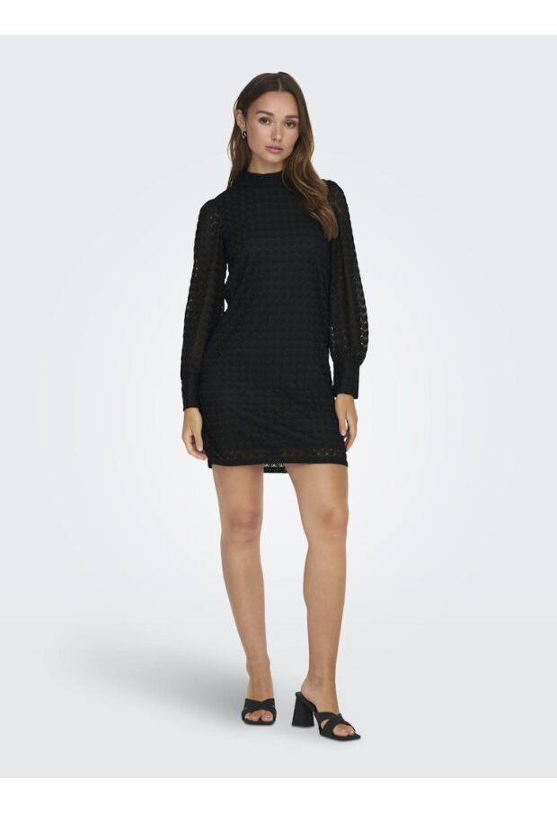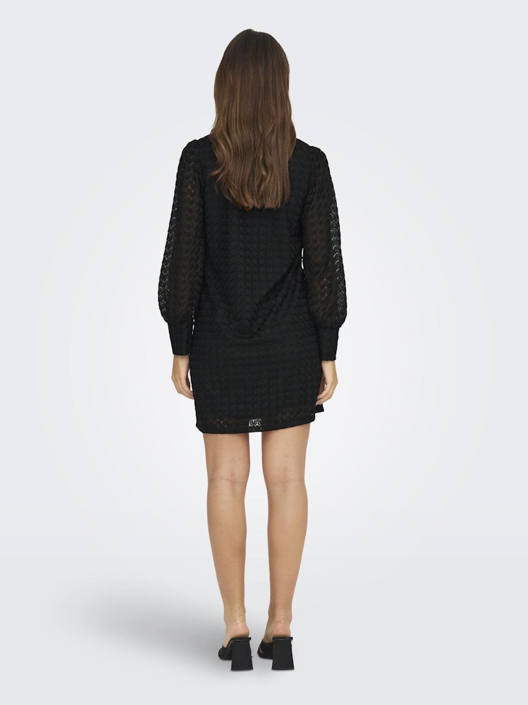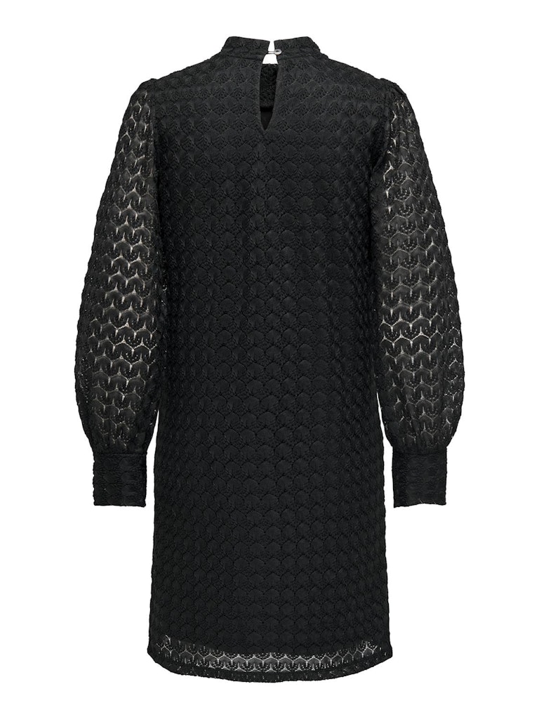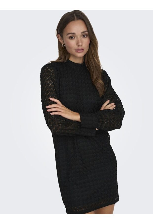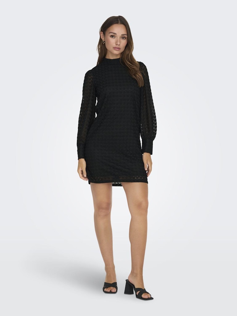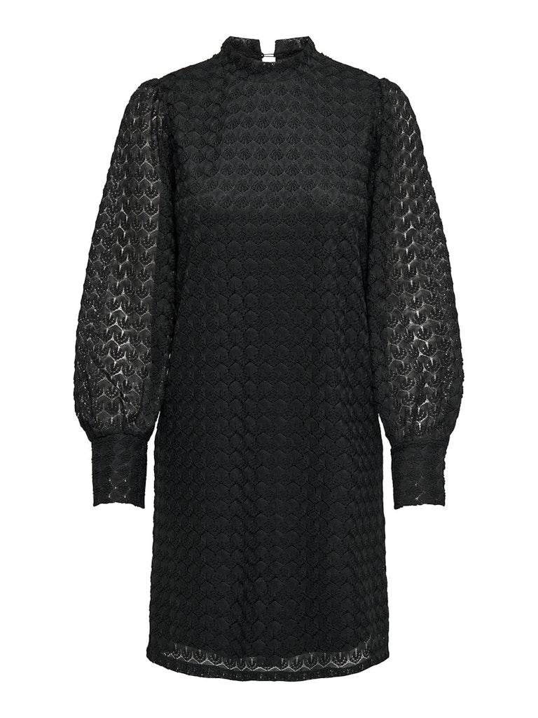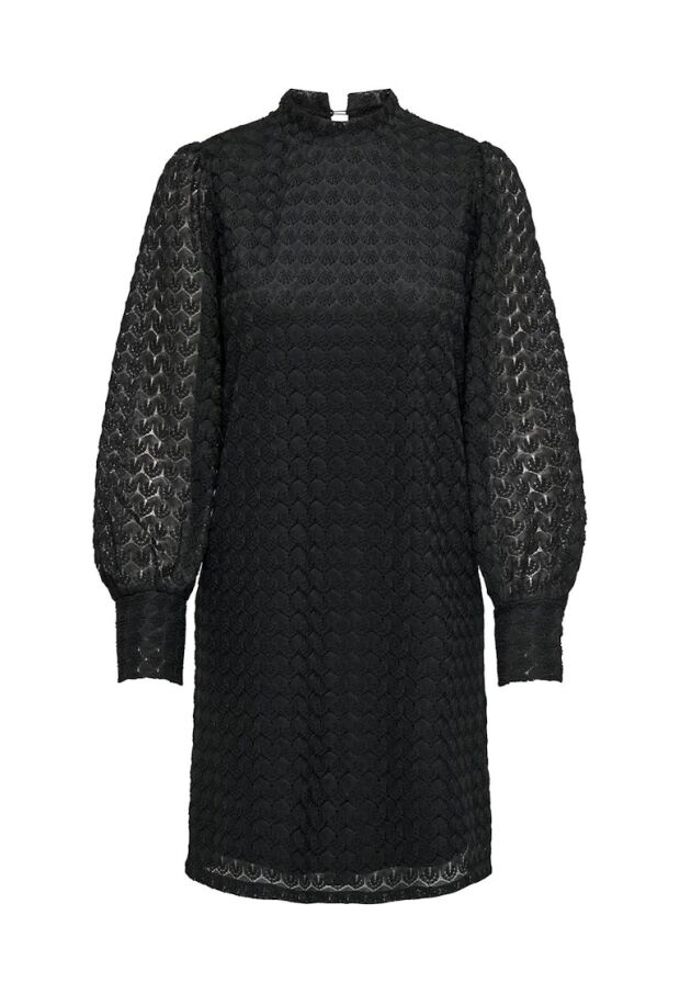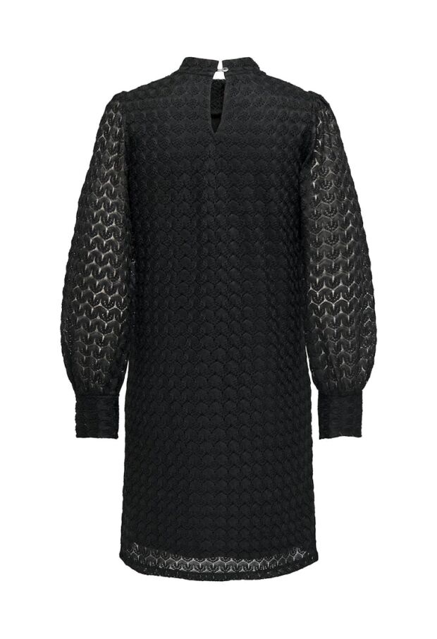 Dress to impress. Deze prachtige jurk in het zwart brengt verschillende trends met zich mee. De hoge hals en de lace stof zorgen er voor dat deze jurk met lange mouwen nooit gaat vervelen. Het hele lijfje heeft een ingenaaide onderjurk, de mouwen zijn echter wel doorschijnend, heb je de druppeluitsparing ter hoogte van de hals al gezien? Deze sluit met 2 knoopjes. Sjieck ! Stijl de jurk met jouw favoriete accessoires en je bent ready to go.