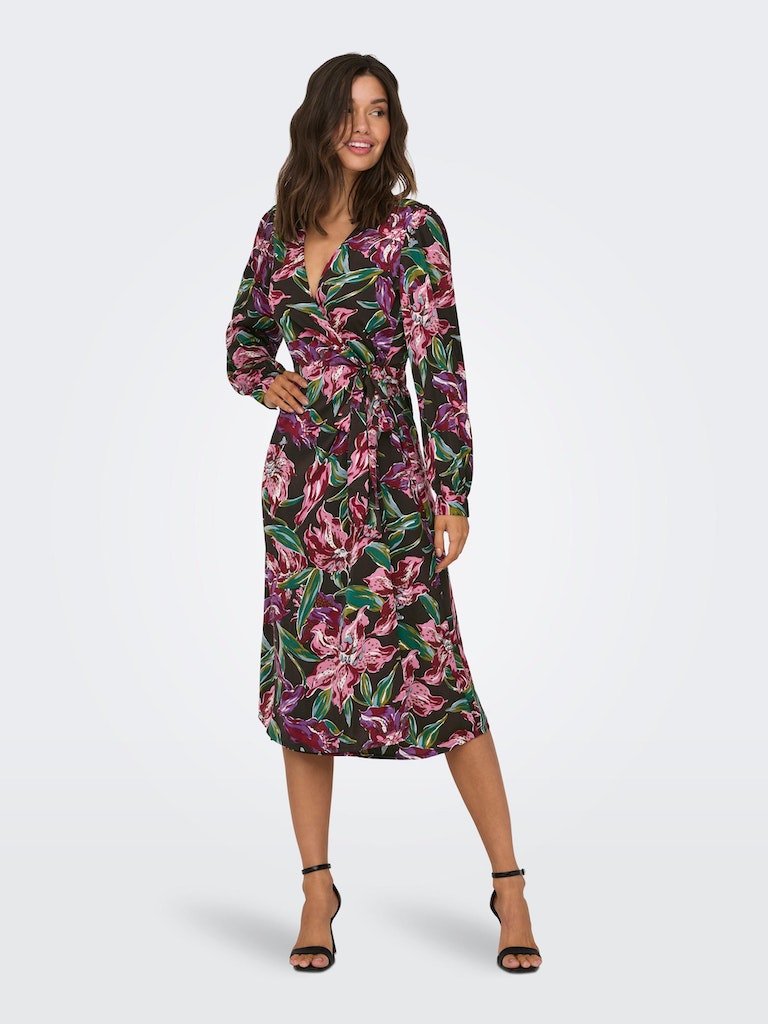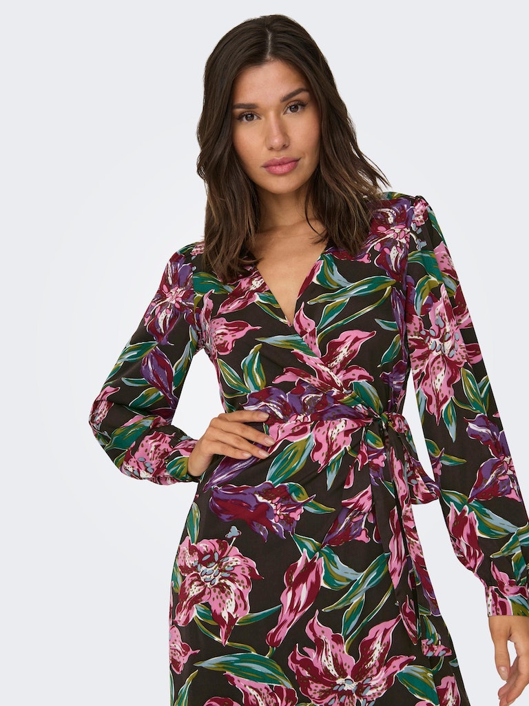 Deze vrolijke overslag jurk heeft lange mouwen en is een lang model.