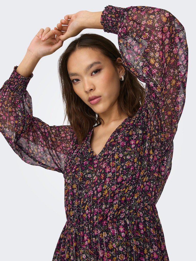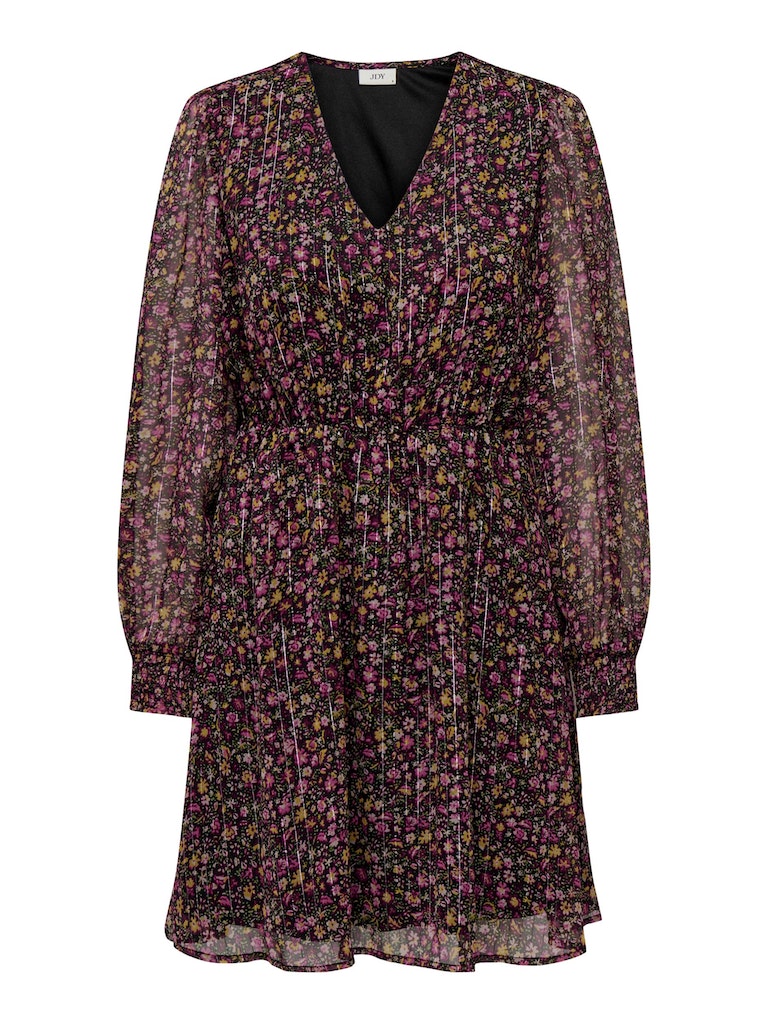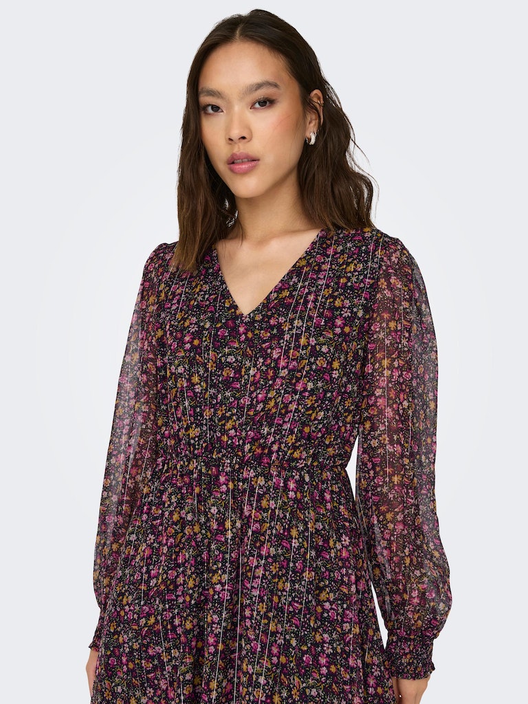 Dit vrolijke jurkje heeft een V hals en een elastiek in de middel om het jurkje iets te laten plooien. Hij komt boven de knie.