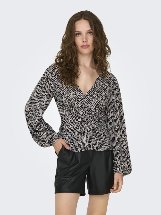 Deze top met knoop heeft een V hals, ballon mouw en een opvallend patroon.